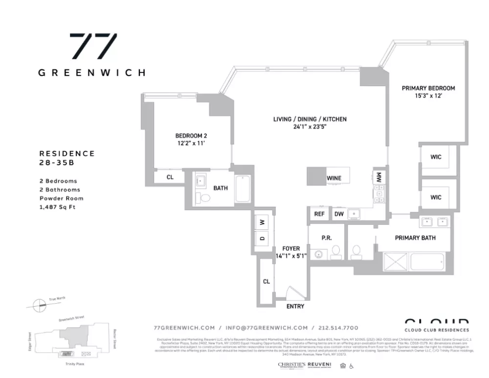 Immediate Occupancy Model Residences Open by AppointmentIntroducing Cloud Club Residences at 77 Greenwich Street. An Air of Elegance Downtown's preeminent new condominium with interiors by celebrated designer Deborah Berke of TenBerke and statement architecture by FXCollaborative. Every home in this luxury defining condominium features a direct view of the NY Harbor.This brand new two bedroom, two and half bath, 1371 SF home includes floor to ceiling crystalline glass windows allowing for an abundance of natural light, stunning water views and soaring ceilings of close to 11'.The gracious entryway features custom millwork and stone flooring. A separate guest powder room features a custom Calacatta Lincoln marble sink and feature wall. The Deborah Berke custom designed European Poliform kitchen is equipped with an elegant, honed Blue de Savoie marble countertop and backsplash, Grohe faucets, and fully-integrated top of the line appliances from Wolf, Sub-Zero, and Miele. The entire kitchen is highly designed to seamlessly integrate natural light and water elements which is evident within the stone and cabinet design elements.The primary bedroom has a spacious walk-in closet and en-suite bathroom with radiant heated honed white striated marble floors, porcelain tile walls, double sinks, custom sycamore vanity cabinets, integrated medicine cabinets, a walk-in rain shower, and a deep soaking tub. The second bedroom has a full en-suite bathroom with honed Arabesque marble floors, floating vanities, and Hansgrohe fixtures. An in-unit Miele washer/dryer, custom millwork, and energy efficient electric heating and cooling with variant refrigerant flow complete this home.77 Greenwich is a luxury-defining LEED certified condominium overlooking New York Harbor and the Hudson River. Featuring a shimmering pleated glass faade, 77 Greenwich soars 500' above Lower Manhattan and contains 90 elegant 1-to-4-bedroom homes by design visionaries FXCollaborative and Deborah Berke of TenBerke.The building offers over 10,000 SF of incredible lifestyle amenities including the exclusive Cloud Club located at the top of the tower, which features 360 degree skyline and water views and includes a fireplace lounge, double-height fitness center outfitted by the Wright Fit, private dining room, flex space for yoga or events and a children's playroomSeparately, the 12th floor will offer a zen garden and dog run.The building is moments from The Battery, South Cove Park, Brookfield Place, One World Trade Center, South Street Seaport, and Battery Park City, and it is surrounded by a wide range of trendy restaurants, bars, cafes, and shops. Nearby subway lines include the 2/3/4/5/R/W/J/Z. Pets are welcome.The listing images represent various units in the building.Exclusive Sales and Marketing: Reuveni LLC, d/b/a Reuveni Development Marketing, 654 Madison Avenue, Suite 1501, New York, NY 10065 and Christie's International Real Estate Group LLC, 1 Rockefeller Plaza, Suite 2402, New York, NY 10020 Equal Housing Opportunity. The complete offering terms are in an offering plan available from sponsor. File No. CD18-0179. All dimensions shown are approximate and subject to construction variances within reasonable tolerances. Plans and dimensions may also contain minor variations from floor to floor. Sponsor reserves the right to makes changes in accordance with the offering plan. Each unit should be inspected to determine its actual dimensions, layout and physical condition prior to closing. Sponsor: TPHGreenwich Owner LLC, C/O Trinity Place Holdings, 340 Madison Avenue, New York, NY 10173.