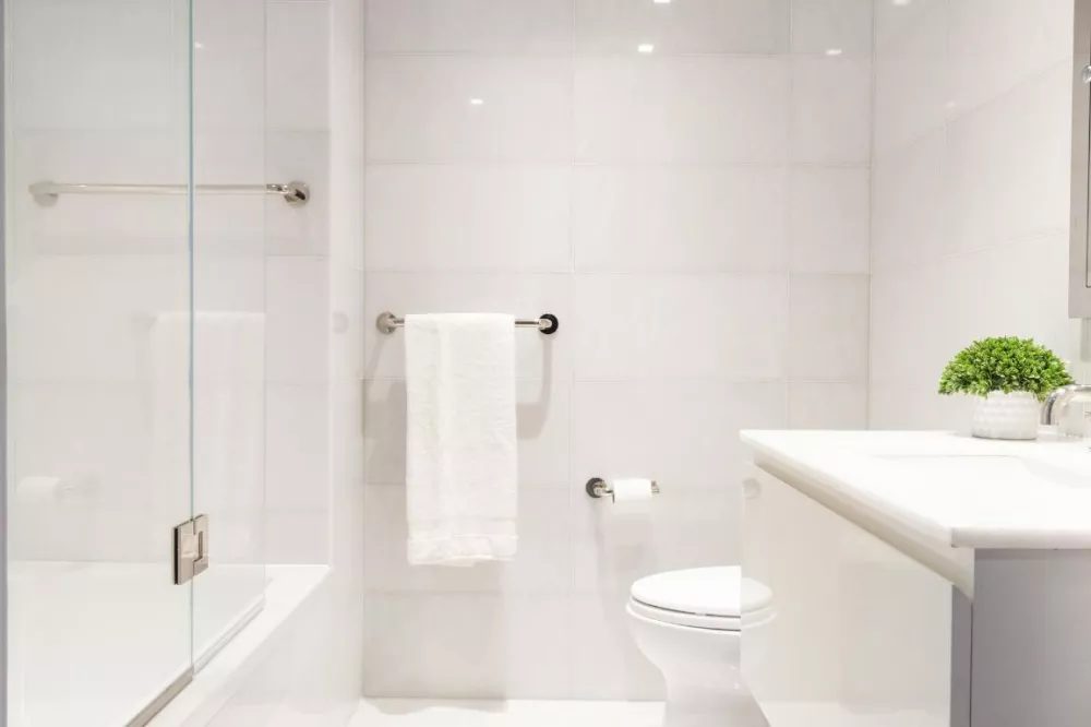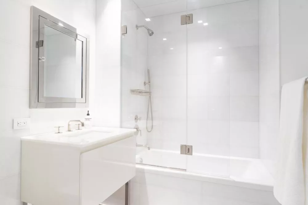 The third bedroom has its own en-suite bathroom and is currently used as a TV and guest room with its custom built-ins and storage drawers. The second bedroom has a two-person custom desk, storage, and a gorgeous bathroom that also has glass enclosures.