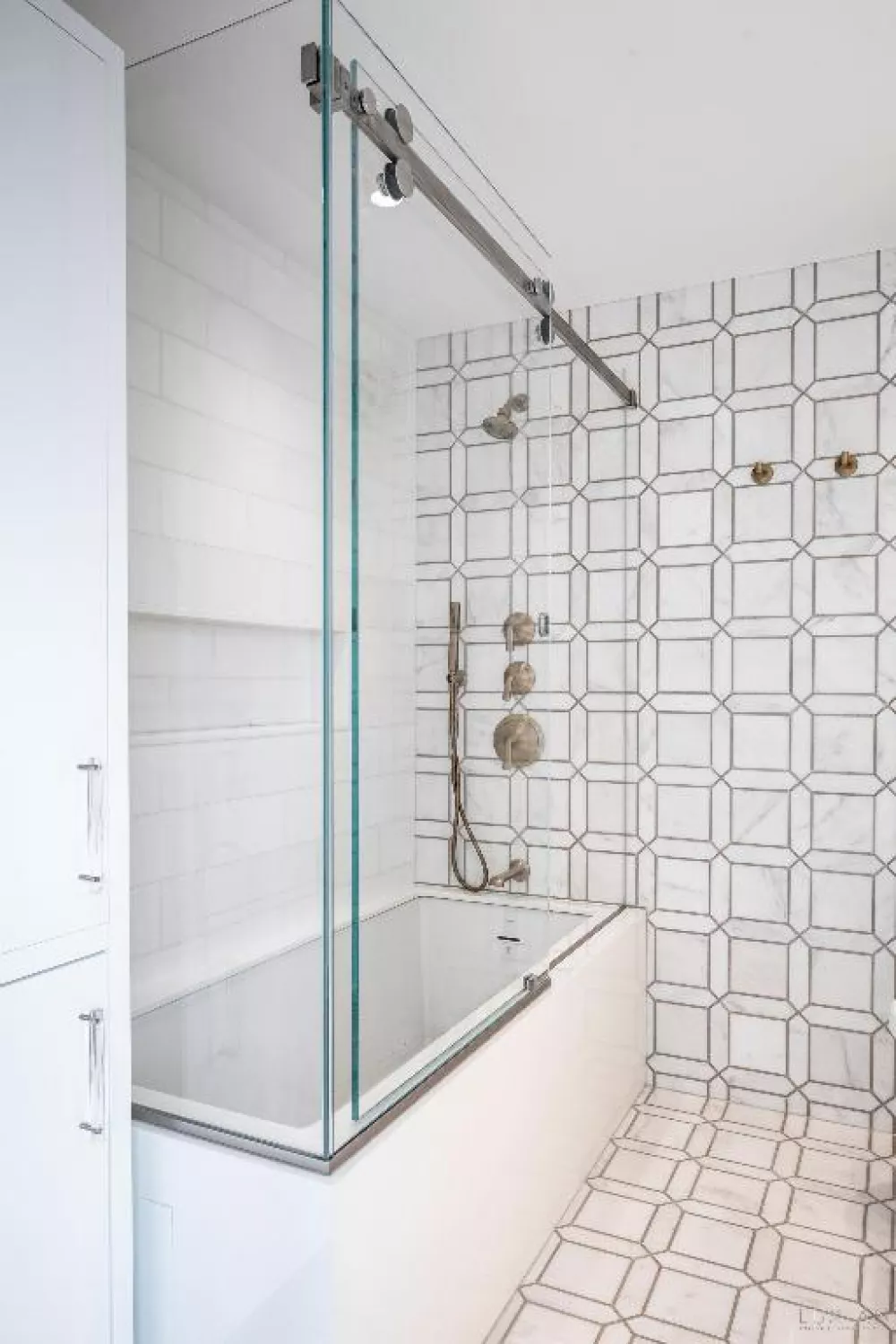 Bathrooms: Each bathroom reflects unique, high-end design, with Calacatta Viola marble sinks, Phillip Jeffries wallpaper, and Kallista Pinna Paletta fixtures. Beautifully designed details include artistic tile accents, wall-mounted Toto toilets, and chevron-patterned laundry room flooring for an elevated aesthetic throughout.