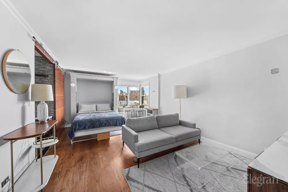 Step inside through a wide foyer lined with oversized, deep closets that lead to an expansive living and sleeping area, highlighted by a custom Murphy bed and built-in storage. A large corner window floods the space with natural light, offering breathtaking views of the West Village and the city skyline—perfect for both entertaining or cozy days at home.