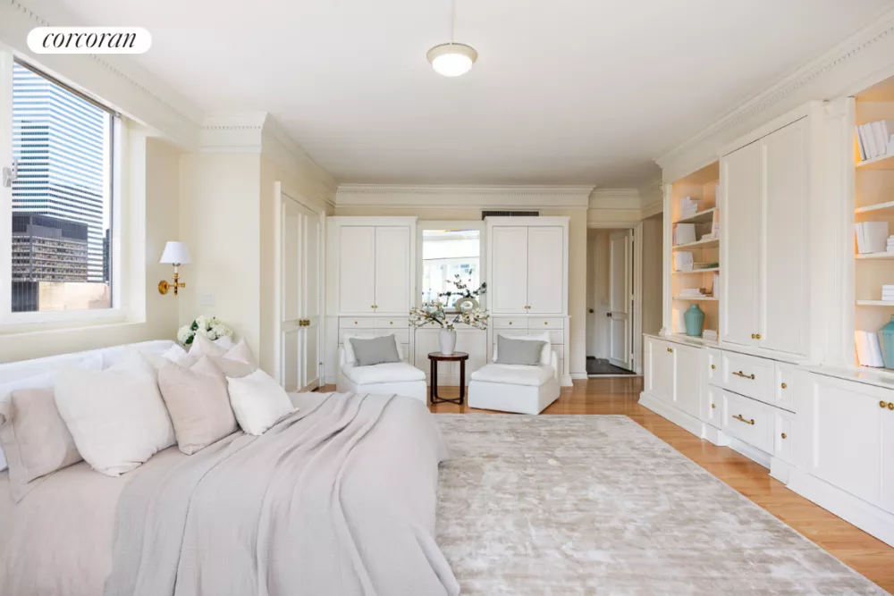 The primary suite is in the corner facing south and west; the bedroom is 27-feet long and has five closets two of which are dressing rooms. There is a windowed en-suite primary bathroom that has two sinks, a deep-soaking bathtub and a separate oversized shower. There are three additional bedrooms or two and a library, and two full bathrooms. There is a laundry area with a washer/dryer.