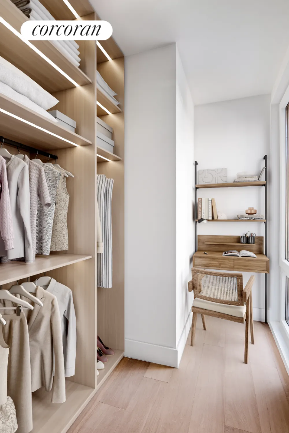 The primary bedroom includes a large, windowed walk-in closet and a linear closet for additional storage, and/or easily usable as a home office cubby. The bathroom showcases large format 24 48 porcelain walls and flooring in a textured medium grey finish. It features a custom Lucena Bath vanity with white resin countertops and a walnut base, along with a brushed nickel Artos faucet. A custom millwork medicine cabinet with LED lighting adds functionality, while the space also includes a Perlato Venezia soaking tub, Gatco fittings, and an Icera Vista wall-mounted tankless toilet. The secondary bedroom also has a large linear closet, and there is an LG full-size stacked washer and dryer for added convenience.