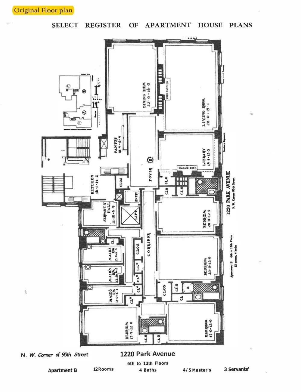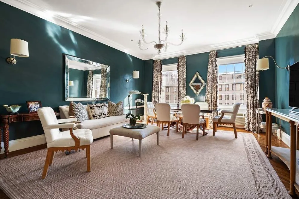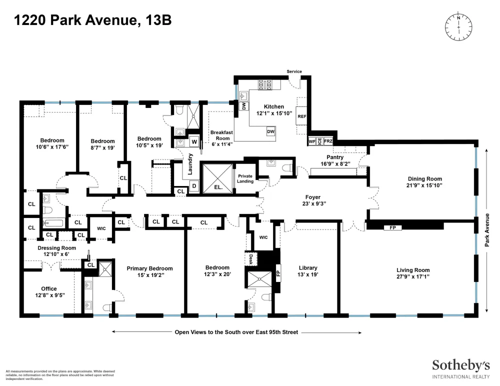 Perched on a very high floor, this coveted corner B-line, 12-into-10 room, apartment at 1220 Park Avenue has five-bedrooms, four-and-a-half-baths, is flooded with sunlight and has sweeping city views over Park Avenue and East 95th Street. Designed by Rosario Candela, this prewar cooperative apartment offers a perfect blend of sophisticated grandeur and modern comfort.