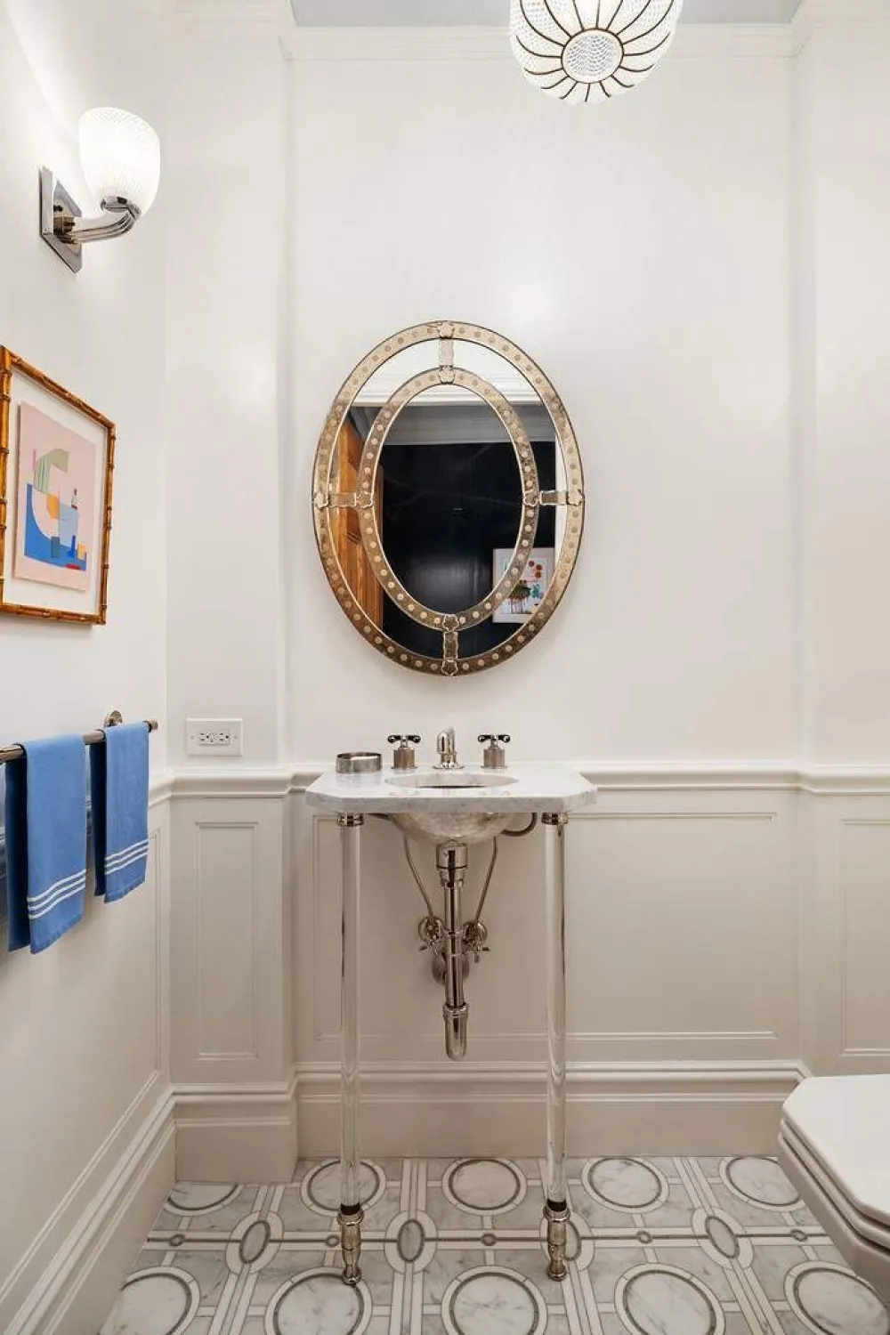 A private elevator vestibule opens to an expansive gallery, setting the tone for the apartment’s gracious proportions, striking ceiling height and refined details. Thoughtfully located off the gallery is a suite of generously proportioned entertaining rooms including an oversized living room, elegant dining room, and spacious library, while also featuring an attractive powder room with a beautifully designed marble floor.