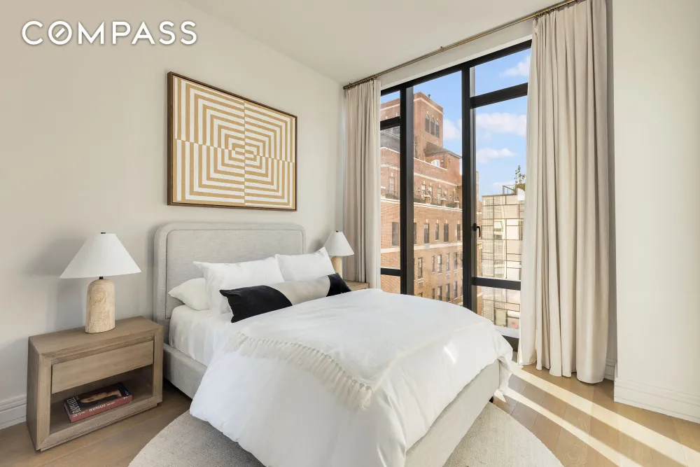 The home features an expansive corner living and dining room, bathed in natural light from floor-to-ceiling windows, with wide-plank solid oak floors and 10’3” ceilings creating a warm and elegant ambiance. The Molteni & C-designed kitchen boasts custom Italian cabinetry, natural stone countertops, Wolf and Subzero appliances, and a central island, blending functionality with style.