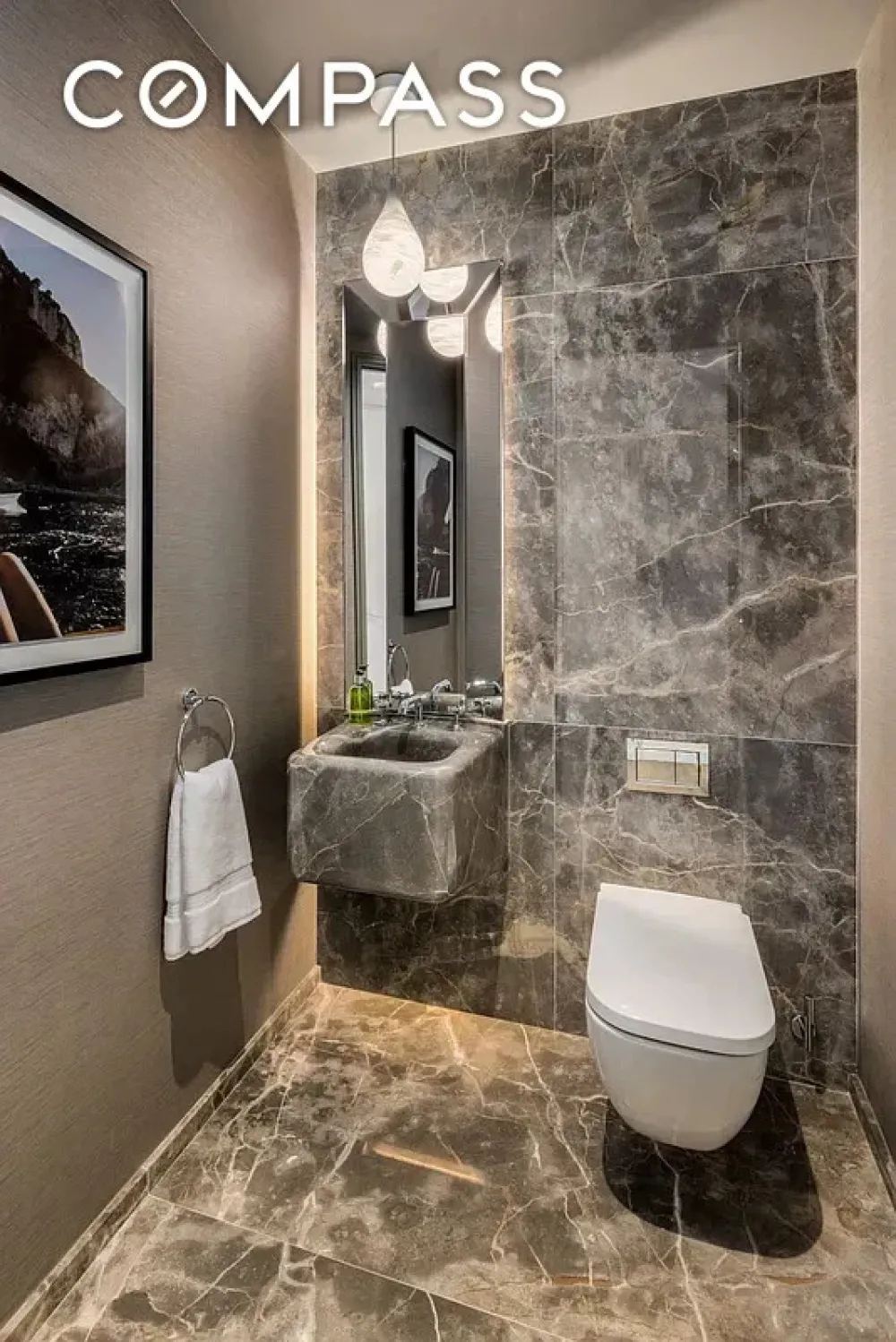 The primary suite is a serene retreat with two walk-in closets, and a spa-like en-suite bathroom with a soaking tub, glass-enclosed shower, and double vanity. From the Calcutta Gold marble slab accent wall to the vanity and sinks which are carved from a single block of Bianco Dolomiti, this exquisite bathroom will surpass your every expectation. Three additional bedrooms include en-suite bathrooms, offering privacy for family or guests, while a powder room, beautifully adorned with polished Fior di Bosco marble, off the entry gallery adds convenience.