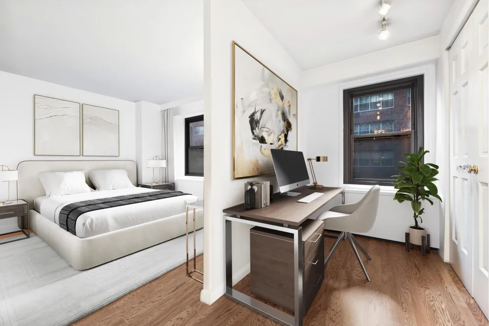 Welcome to this spacious alcove studio, thoughtfully converted into a one-bedroom layout with an additional home office. Bathed in natural light, the apartment boasts four south-facing windows ensuring brightness throughout the day. Storage is a breeze with an abundance of custom closets.