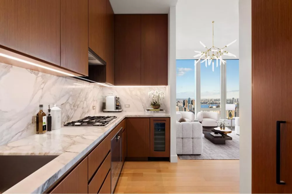 The Gachot-designed kitchen is a masterpiece, featuring custom rift-cut cabinetry, a honed Calacatta Borghini marble waterfall island, and backsplash. Equipped with premium Gaggenau appliances - including a cooktop, combi-steam oven, double convection oven, refrigerator, and wine cooler - it's ideal for culinary enthusiasts. Throughout the residence, the 5-inch white oak plank flooring and 9-foot solid walnut doors create a warm, refined ambiance.