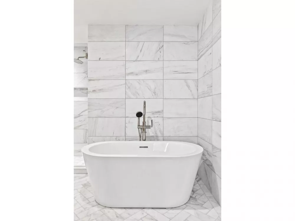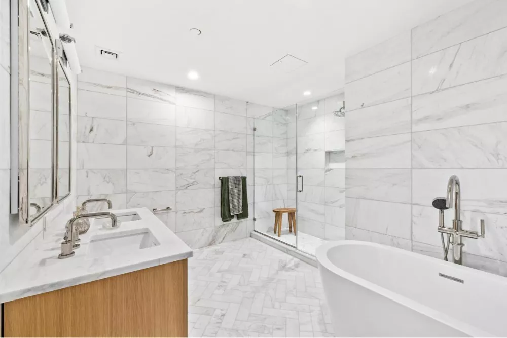 Featuring a generous secondary bedroom and bathroom, both thoughtfully arrayed for maximum tranquility. Let the cares of the day melt away as you enjoy a soak in the tub or a good night's sleep. Design touches include polished nickel finishes and an ample vanity in the bathroom and, in the bedroom, there is abundant space for storage. No detail was overlooked in this primary bedroom, and it is sure to wow even the most meticulous of buyers. A designer double vanity and soaking tub elevate the tranquil bath and the herringbone tile adds pizzazz to the master bath.