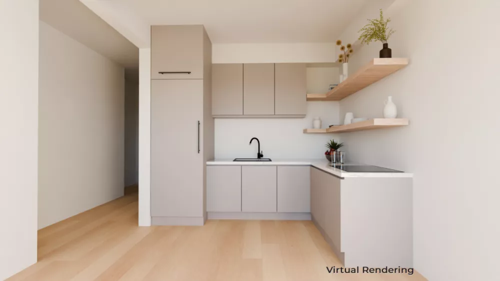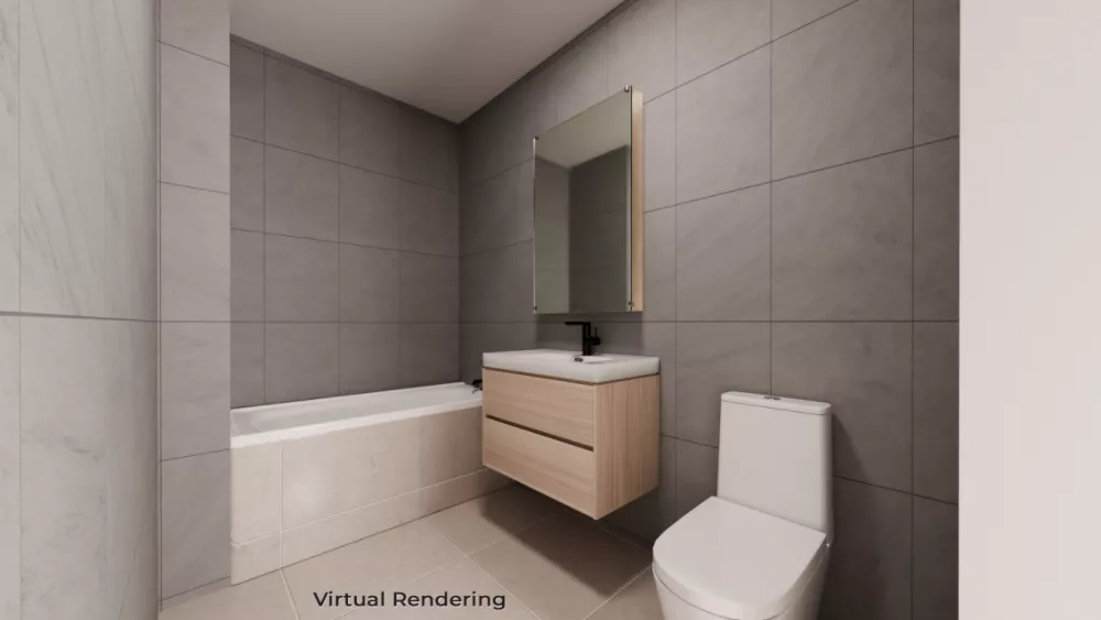 Residence 3A features a spacious one-bedroom, one-bathroom layout within 617 sq.ft of interior space. The generously sized bedroom comfortably accommodates a king-sized bed. This apartment is equipped with modern conveniences, including a thru-wall AC, and a dishwasher. Additionally, it boasts a private balcony that overlooks a serene garden, offering a peaceful retreat.