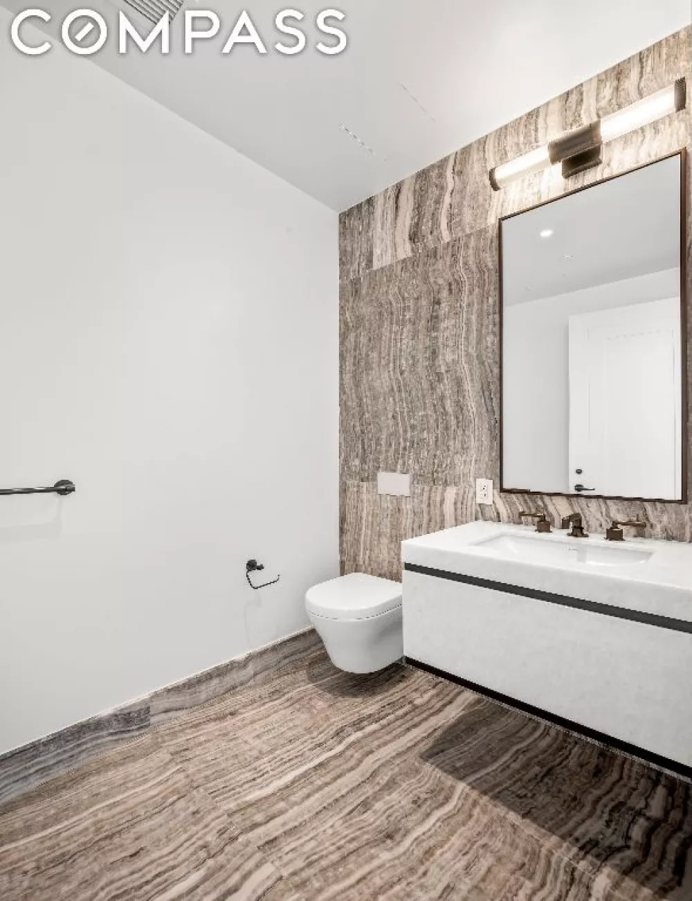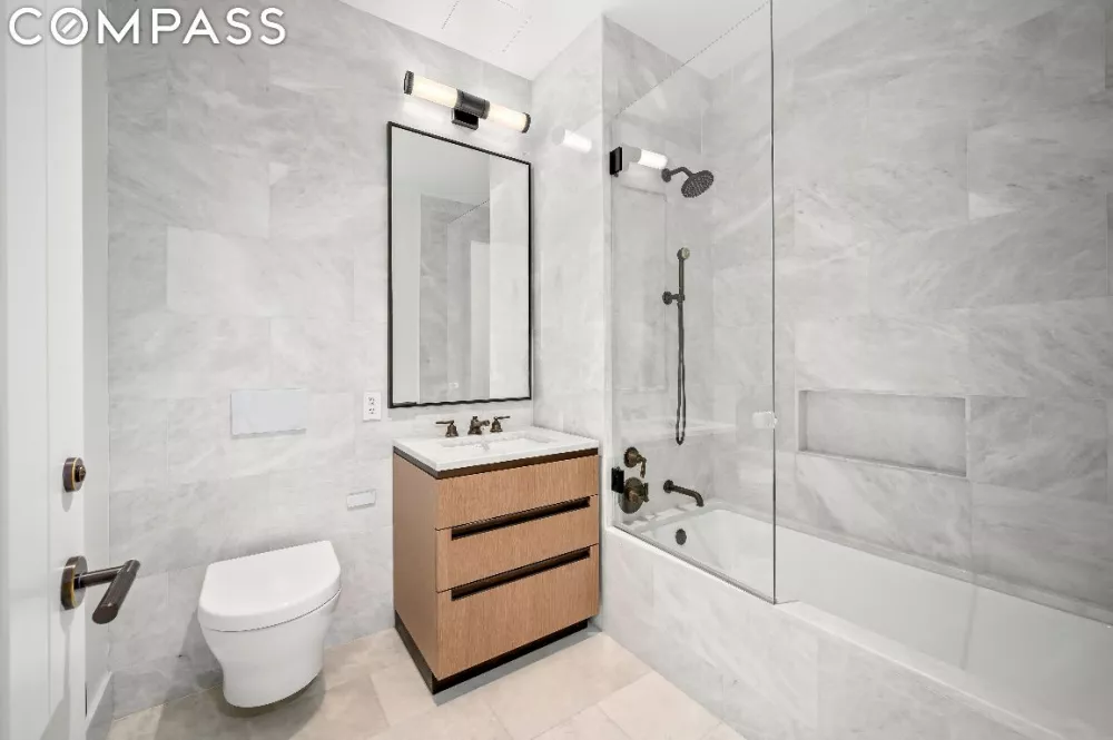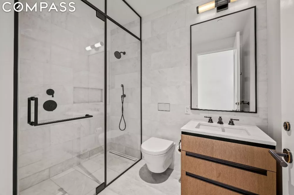 The primary suite is a serene retreat, boasting a walk-in closet and a spa-like en-suite bathroom. Here, you’ll find Nestos Beige marble slabs on the floors and walls, Polished Opal White marble countertops, and a custom vanity illuminated by bronze-finished sconces and fluted mirror panels. A wall-mounted Toto toilet and radiant heated floors provide added luxury.