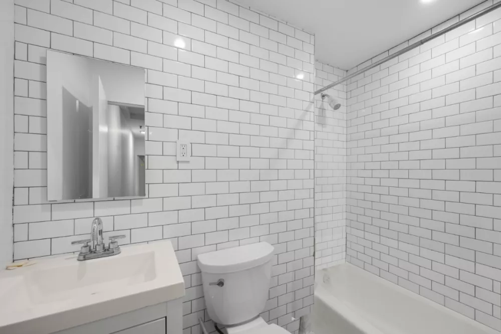 Past the kitchen is a pristine full bathroom with white subway tile walls, chic fixtures, and a deep soaking tub.