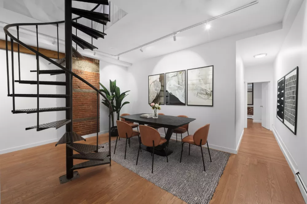 Seconds from exciting dining, shopping, and nightlife, this stunning Lower Manhattan gem boasts a wraparound patio, a wood-burning fireplace, exposed brick walls, a spiral staircase, and a spacious storage loft.