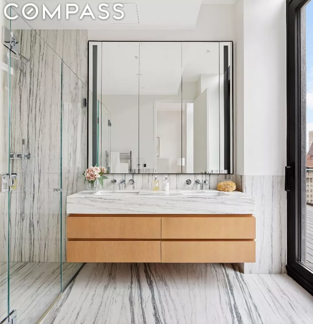 Open-plan kitchens offer the same level of sophisticated design, master craftsmanship, and thoughtful material selection as N°33 Park Row’s exterior architecture. Designed with furniture- quality custom white oak cabinetry and sculptural honed tundra gray marble islands with waterfall edges, the kitchens are seamlessly integrated to form a visually stunning living and entertaining experience.??Primary bathrooms recall an ancient European spa, reimagined for contemporary sensibilities. Dramatically veined and book-matched honed Montclair Danby marble cladding and modern vanities with radiant heated floors are brought together to create a tranquil respite from the outside world.