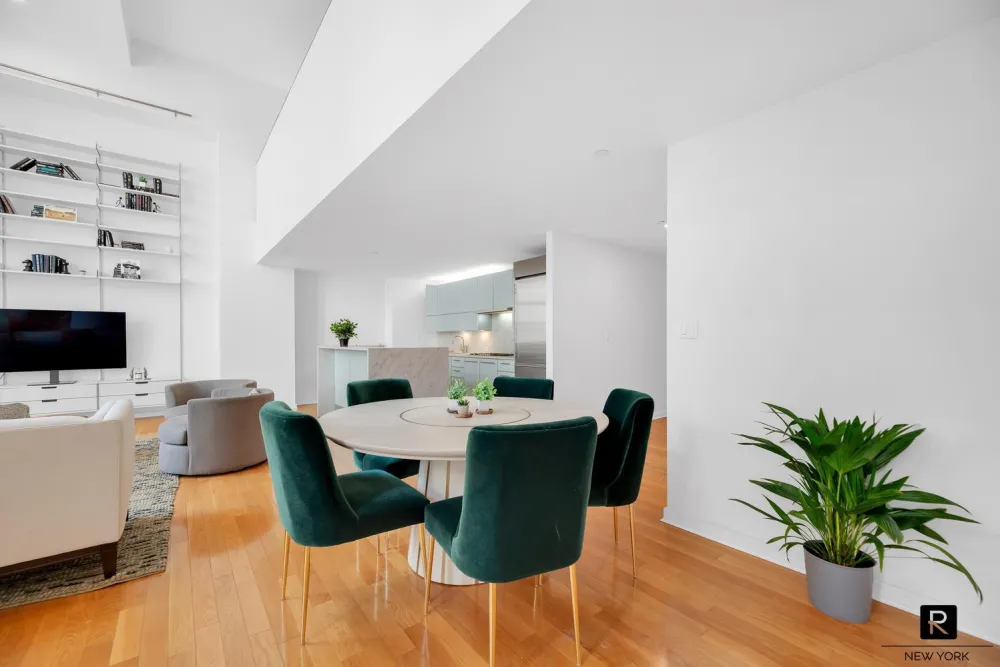 Enter a spacious foyer perfect for displaying works of art, leading to a stunning 17ft high ceiling living room with impressive oversized windows, an open kitchen, and a dining room space. This layout is perfect for entertaining and hosting social events.