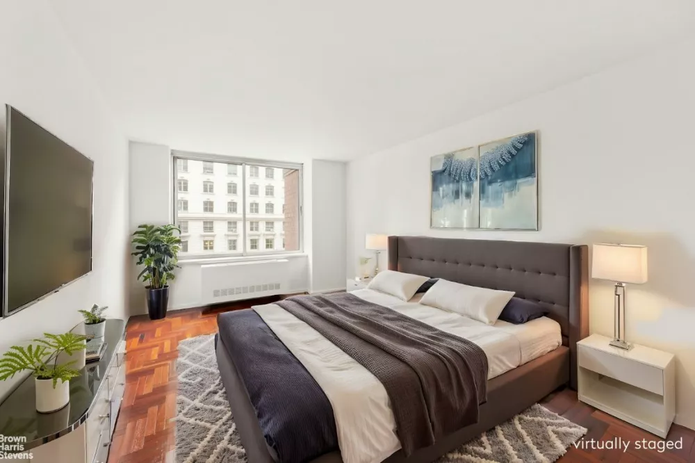 This fabulous East facing one bedroom one bathroom home receives tons of natural light and has great views of the Broadway Mall. The upgraded kitchen has granite countertops, newer stainless steel Fridge and microwave, plenty of cabinets and a pass thru  into the living/dining area. The bedroom is spacious and can easily hold a king-sized bed, bedroom set and a spot to carve out for a desk, if needed. The marble bathroom has been polished and shines! Top of the tree views are included along with quick access  to the elevators.
