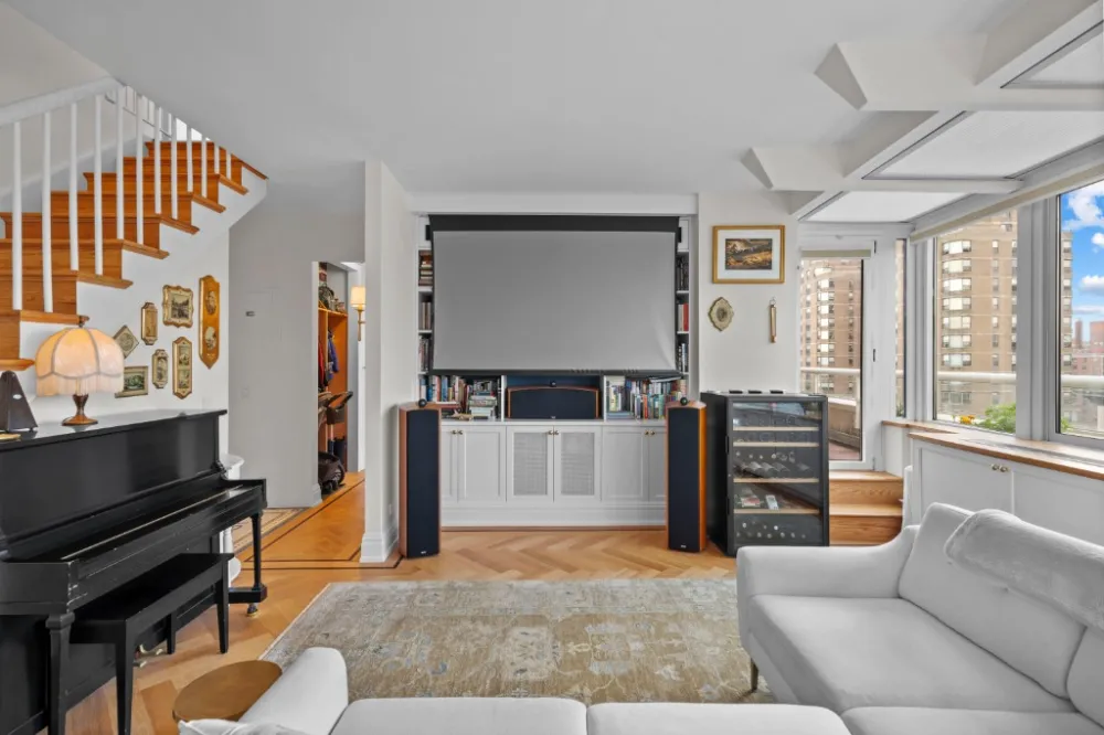 The grand main living room boasts a home theater projector system with wired surround ceiling speakers and recessed motorized cinema screen, floor-to-ceiling bookshelves plus media cabinets, direct terrace access, and expansive city views.