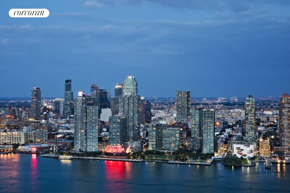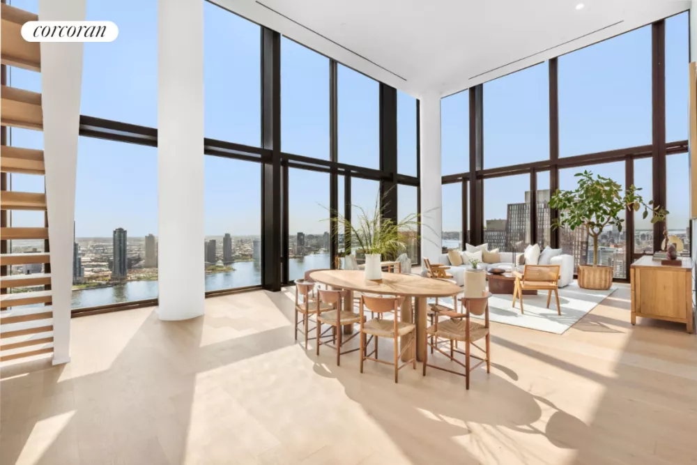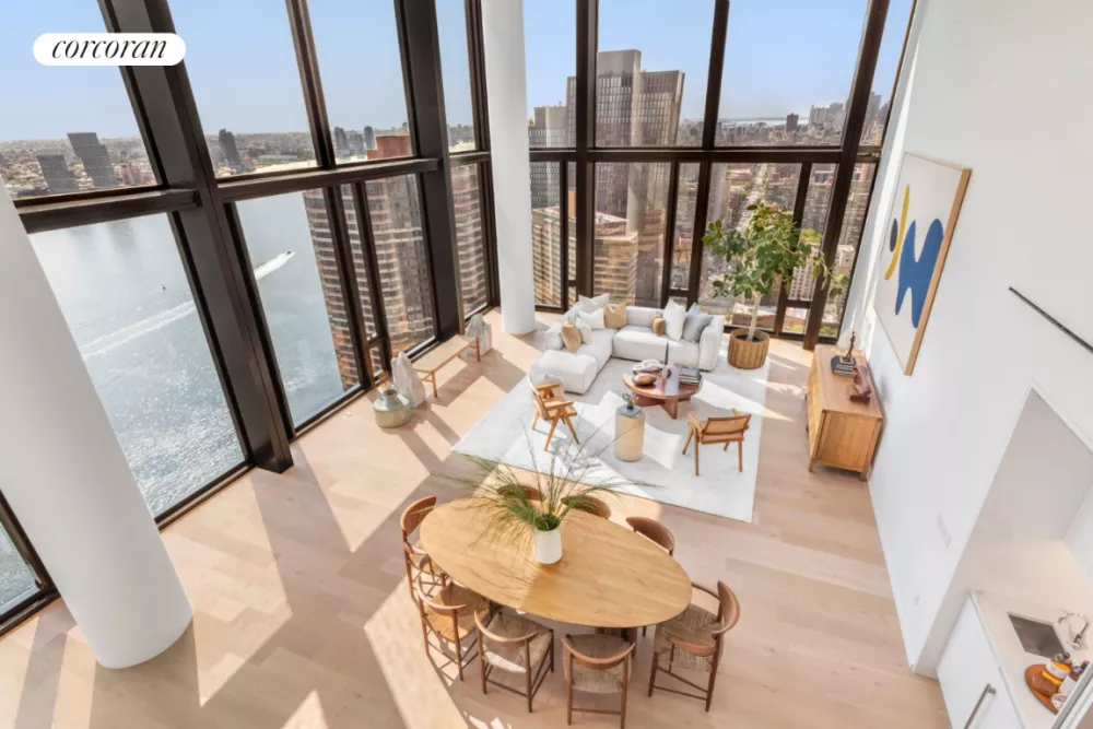 Residence 40D at One United Nations Park is a 3,831sf four bedroom, four bathroom plus powder room, Duplex residence with a dramatic double-height great room and ceilings soaring 20 feet high. Perched on the southeast corner and flooded with sunlight, the gracious layout features a separate den/home office, eat-in kitchen with large island, and an internal private elevator. The primary suite boasts a walk-in-closet and grand primary bathroom with double vanities and freestanding tub. The floor-to-ceiling windows throughout highlight the river and city views down the avenue and beyond.