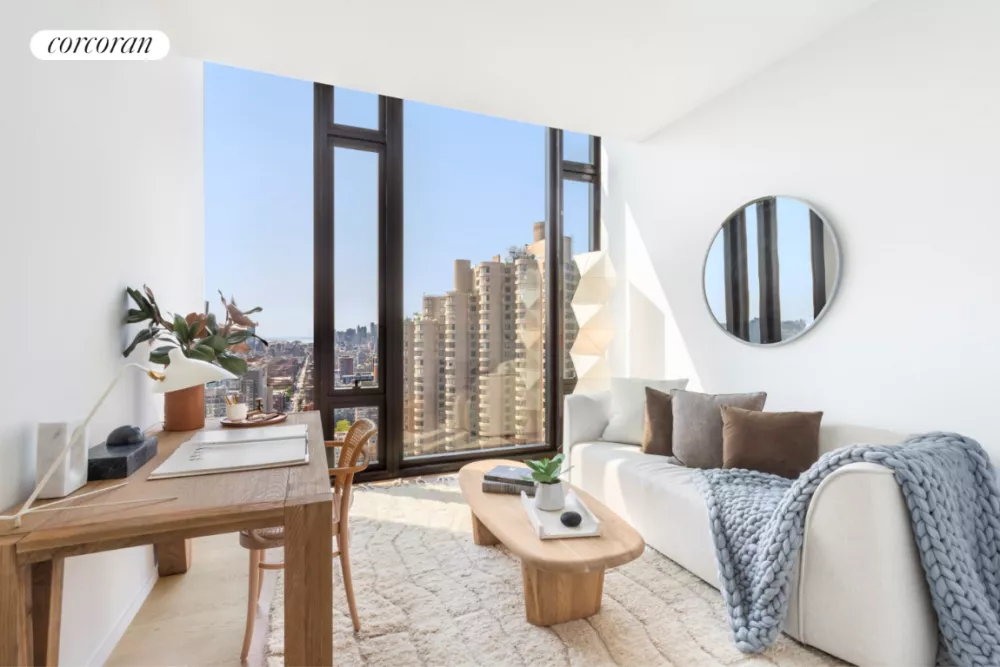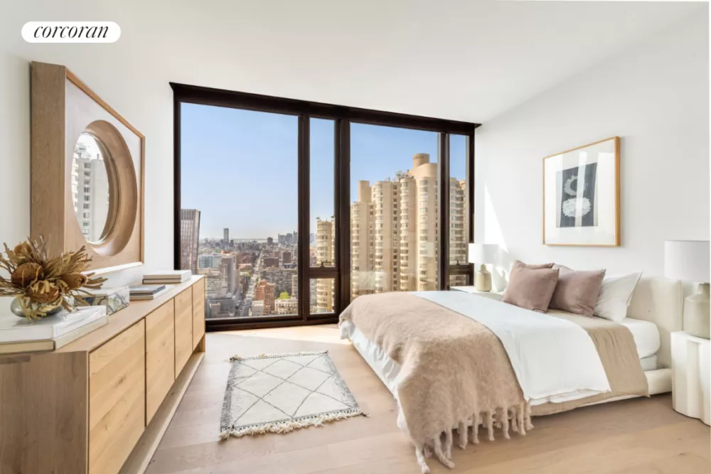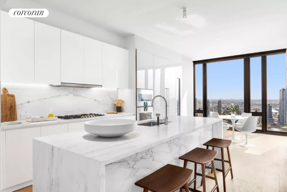 Designed by Meier Partners, the residence interiors are a striking contrast to the black glass exterior, reflecting a white color palette. Living spaces are immersed in natural light radiating through the floor-to-ceiling windows. White oak floors are found in all residences and open kitchens boast white Calacatta Lincoln marble counters, Dornbracht fixtures and Gaggenau appliances clad in custom-crafted Italian white lacquer. Each residence is equipped with a built-in Crestron smart home system that regulates temperature, lighting and the motorized window shades. These functions can be seamlessly controlled by residents through any iOS or Android device.
