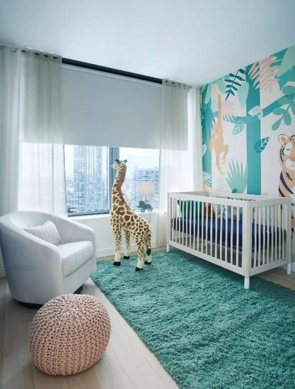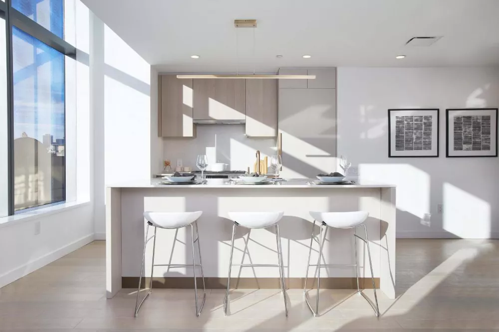 The high floor direct west facing two bedroom is an impressive residence with a jaw-dropping view of the Manhattan skyline. It features distinctive European white oak engineered wood flooring throughout and a side by side bedroom layout; the spacious master bedroom has a walk-in closet. The contemporary, beautifully designed island kitchen is ideal for entertaining. It is composed with cabinetry finished with sand ash veneer and extreme matte laminate, a Viatra quartz slab countertop and backsplash, top-of-the-line Bosch appliance package that includes an outside venting range hood, and Monogram microwave.