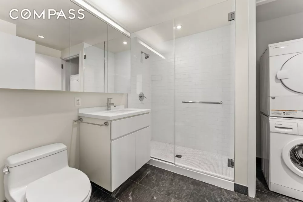 The First Floor. The open layout combines living/dining areas with space for a full suite of furniture. The sleek kitchen features honed white quartz countertops, white cabinetry, stainless-steel tiled backsplash, concealed Liebherr refrigerator, and Miele appliance package – convection oven, four-burner gas cooktop, microwave oven, range hood, and dishwasher. The first-floor bedroom has an adjacent full bathroom with a Bosch washer and dryer.