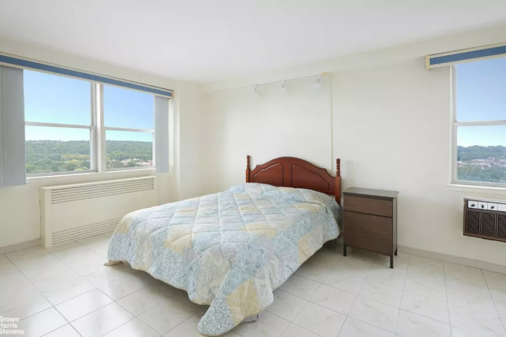 Move right into this spacious corner two-bedroom/two-bath "C" line with terrace at Skyview on the Hudson. You'll enjoy open eastern and southern views of lush Van Cortlandt Park. Immediately off the entry hall, with multiple closets, is a large open living/dining room with easy access to the windowed kitchen. Oversized split bedrooms provide great light and easy bathroom access (primary bedroom has an expanded wheelchair accessible en-suite windowed bathroom). Apartment #9C is off the elevator corridor (no catwalks) and features generous closet space and beautifully tiled flooring throughout.