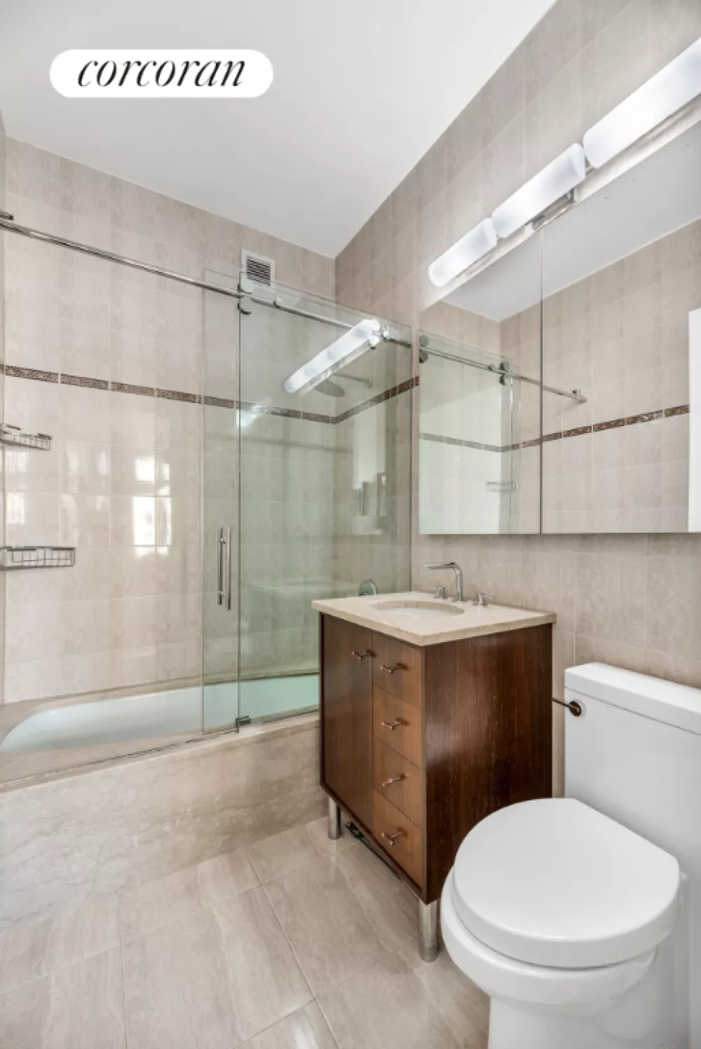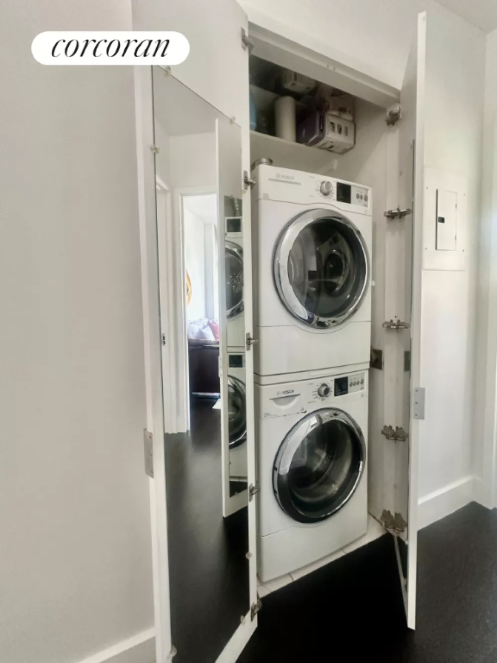 Apartment 19D boasts a private balcony with expansive west, north, and south-facing views, 10-foot ceilings, and floor-to-ceiling windows, offering uninterrupted, panoramic cityscapes. The well-lit kitchen features large windows and high-end appliances, while the in-unit washer and dryer add convenience. The bathrooms are finished with elegant marble, spacious layouts, and ample storage within large, mirrored medicine cabinets. Abundant closet space throughout the unit ensures excellent storage, while the limited number of units per floor guarantees enhanced privacy-a rare find in high-rise living.