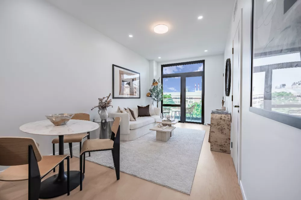 Residence 4B invitingly welcomes residents home with an open-concept living room, dining room, and kitchen. The living area leads directly out to the balcony, while the kitchen is expertly crafted with an eat-in waterfall peninsula with overhang for modern breakfast bar stool seating, custom two-tone oak cabinetry, gleaming quartz countertops and backsplash, and a full suite of high-end stainless steel Bosch appliances, including a refrigerator with a filtered water dispenser.