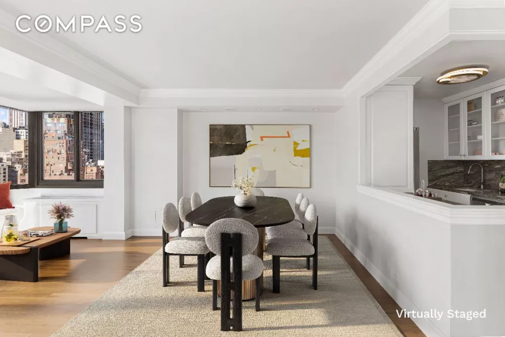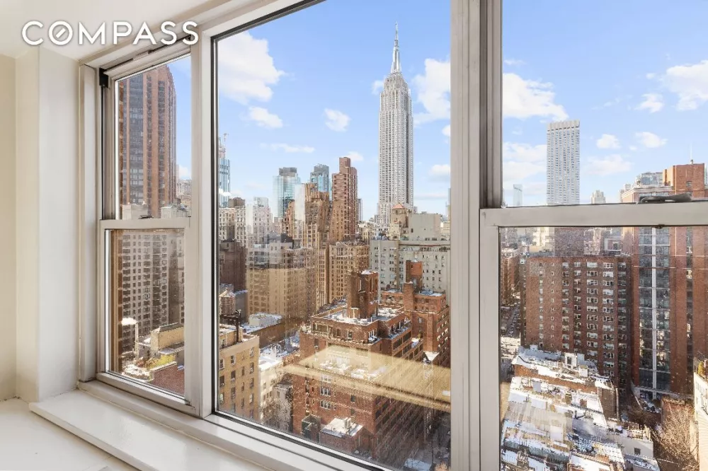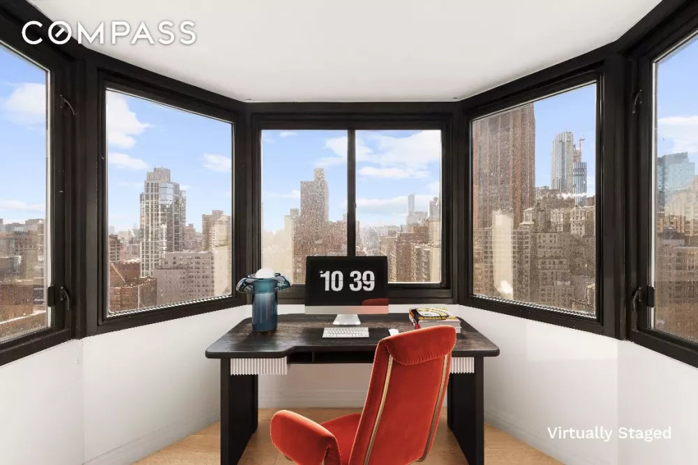 Bring your sunglasses! Spanning approximately 1,100 square feet, the coveted A Line is the largest 1bedroom, 1.5 bath residence in the Carlton Regency. This corner Jr. 4 room layout welcomes you with a well-appointed foyer and a conveniently located powder room. Two stunning glass-enclosed solariums provide three exposures, offering panoramic views over Midtown Manhattan, including the Empire State Building and the southern skyline down to One World Trade Center. The king-sized primary bedroom boasts views with a southern exposure, generous closet space and a windowed en-suite bathroom with a double sink vanity. The photographs of this vacant home have been virtually staged to provide you with inspiration.
