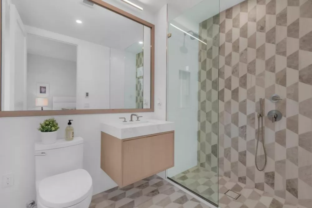 Both spa-like bathrooms are adorned with bright Italian Porcelanosa stone tiles, Carrera Caesarstone sinks, glass showers, and radiant heated floors. A windowed view ensures a refreshing start to your day, while ample closet space throughout the home provides effortless organization.