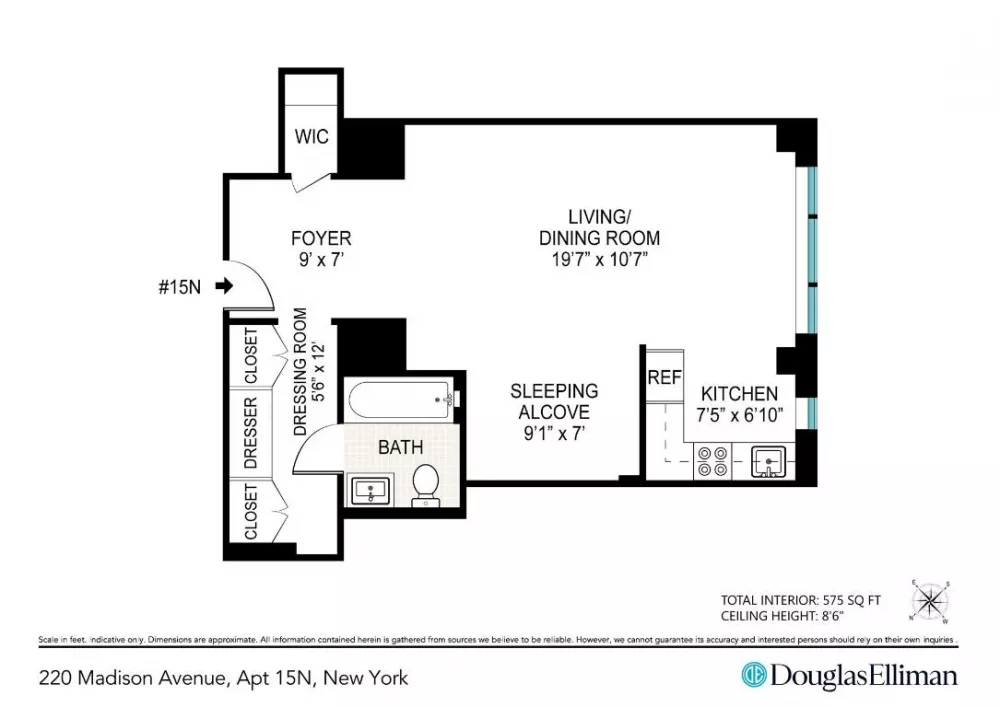15N is perched on the 15th floor. It is a spacious studio with an alcove hosting your sleeping area. A turn-key property, with views of the glorious Empire State Building. With high ceilings, windowed fully equipped kitchen, multiple custom design dressing room, this studio apartment stands as one of the most attractive pied-a-terre or living space in the building and neighborhood.