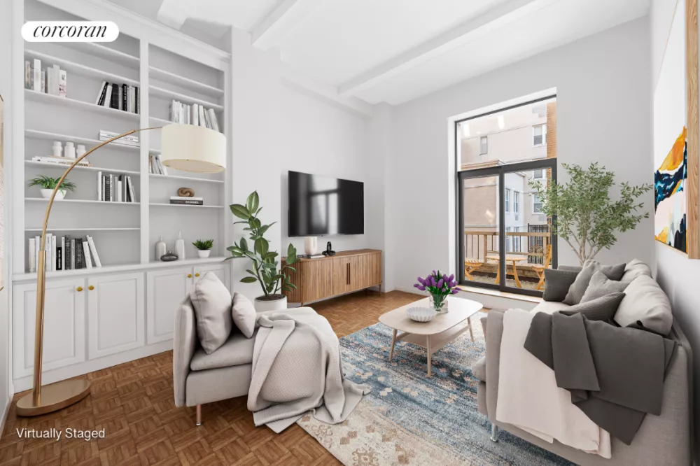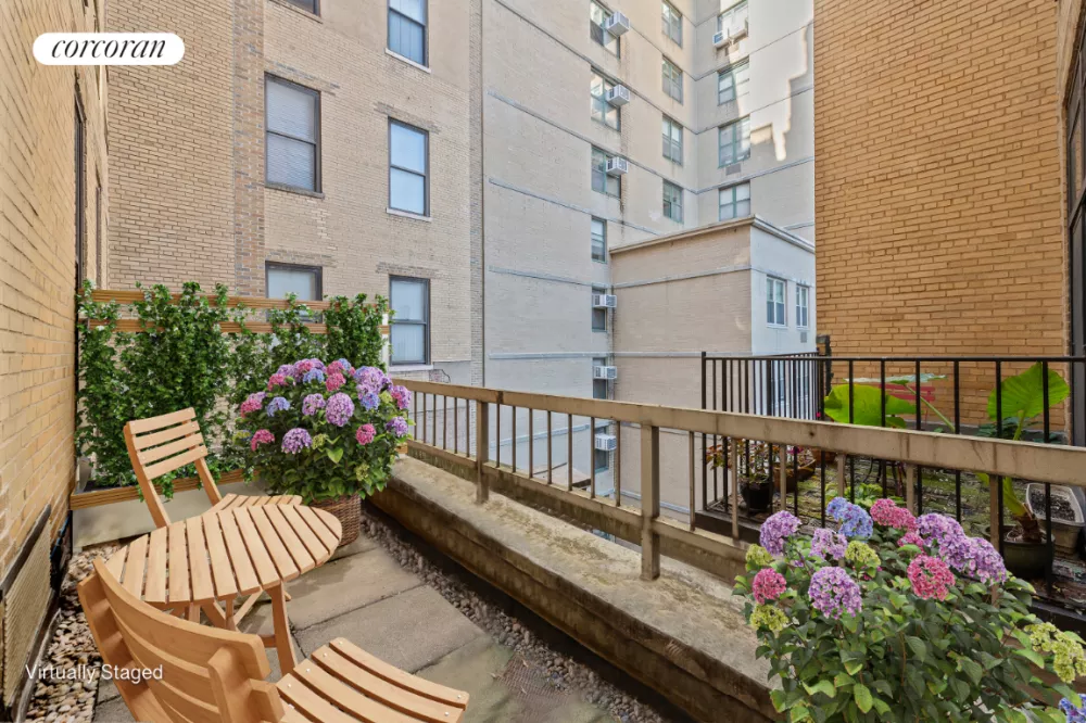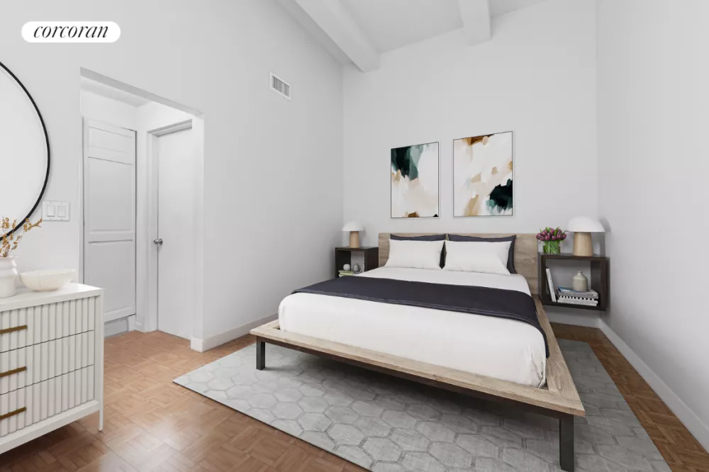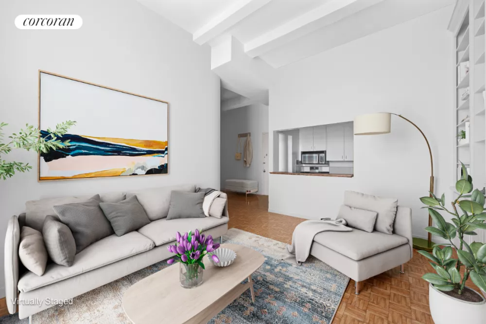 The spacious junior one-bedroom exudes sophistication with its impressive 13-foot beamed ceilings, open-concept kitchen featuring stainless steel appliances, quartz counters and tile, hardwood floors, and a private balcony-a perfect spot to soak in the ambiance of early 20th-century Paris.