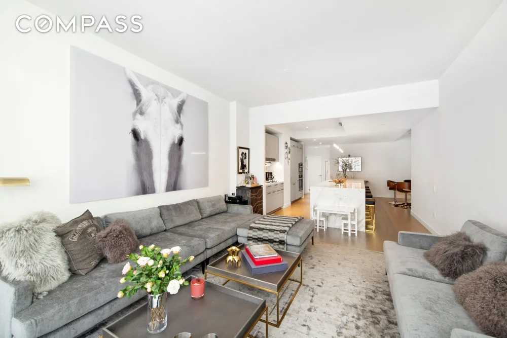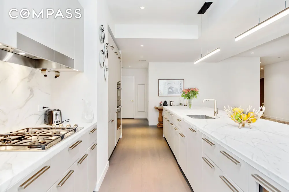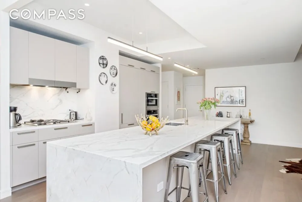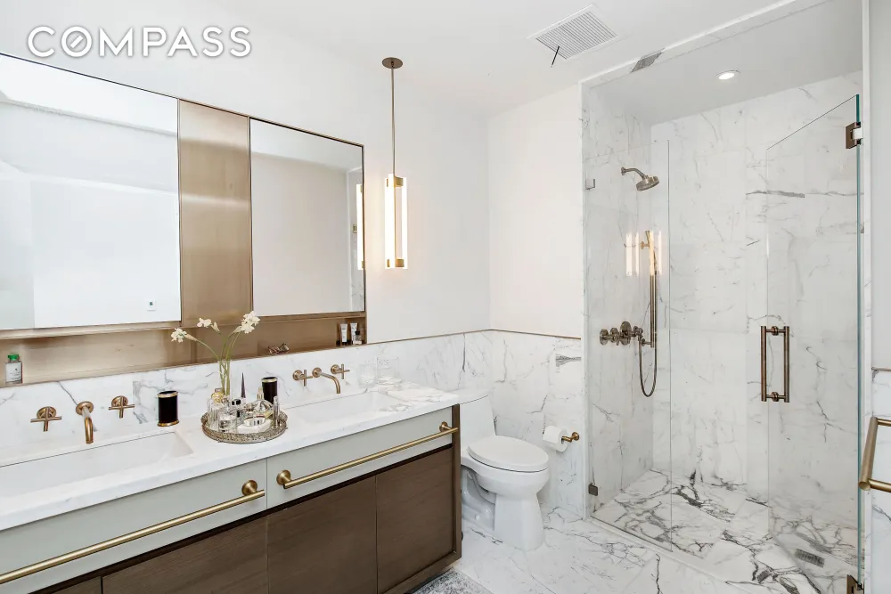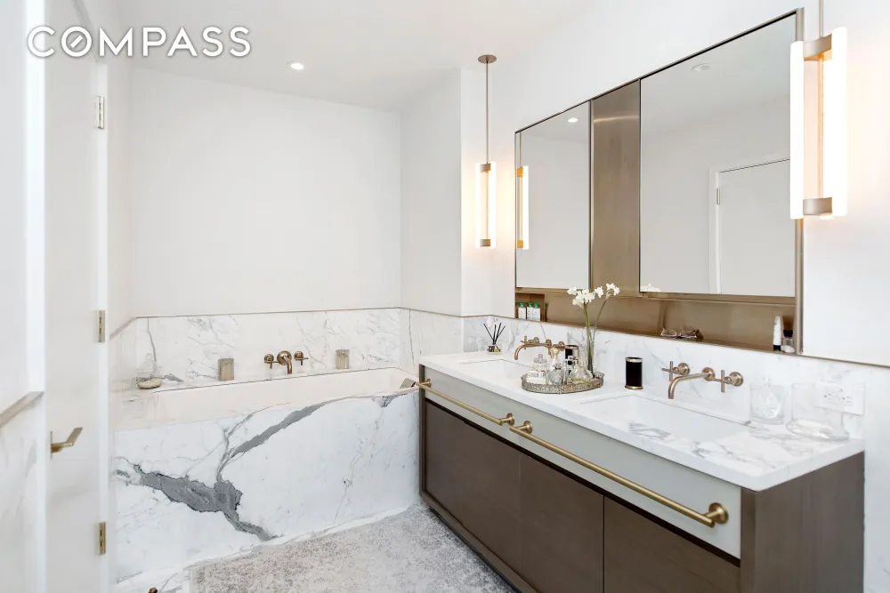 two enormous walk-in closets in the master, enjoy light and the modern luxury of incredible amenities that this new development has to offer. This unit features south/east bright exposure and unobstructed, city views. Designed by S. Russell Groves, this apartment features 10’ ceilings, double-paned windows by Old Castle and Argon-gas-filled air pockets for increased energy efficiency and sound dampening. Six-inch wide plank oak floors stretch across the space and bleached walnut entry doors compliment the clean design. Residents access an easy bronze resident destination panel. Attention to detail abounds, like solid core wooden interior doors in white lacquer everywhere. Inhabitants control individual heating and cooling zones by Climate Master with thermostat. The unit includes Bosch washer and condenser dryer, concealed within spacious built out, walk-in laundry closet. Cook in your custom designed kitchens by Poliform featuring Silver Fox lacquered cabinetry crafted with soft-closed drawers and under-cabinet lighting. Calacatta Gold Lignano marble highlights countertops, backsplash, and custom island (with overhang for bar stool seating and recessed overhead lighting). Enjoy the reliability of German-engineered Miele refrigerator and freezer with integrated panel to match cabinetry. Miele electric ovens with gas cooktops and exhaust hood are a cook’s delight. Hideaway Miele dishwasher is both quiet and powerful. Calibrated Subzero wine cooler protects a cherished oenological investment. Wolf microwave drawer is built from professional grade stainless steel. Undermount sink with Kohler spray faucet (in brushed bronze) integrates convenient disposer. Lounge by the heated indoor pool or exercise in the well-appointed fitness room. Club room and children’s playroom available, for whichever suits your mood.