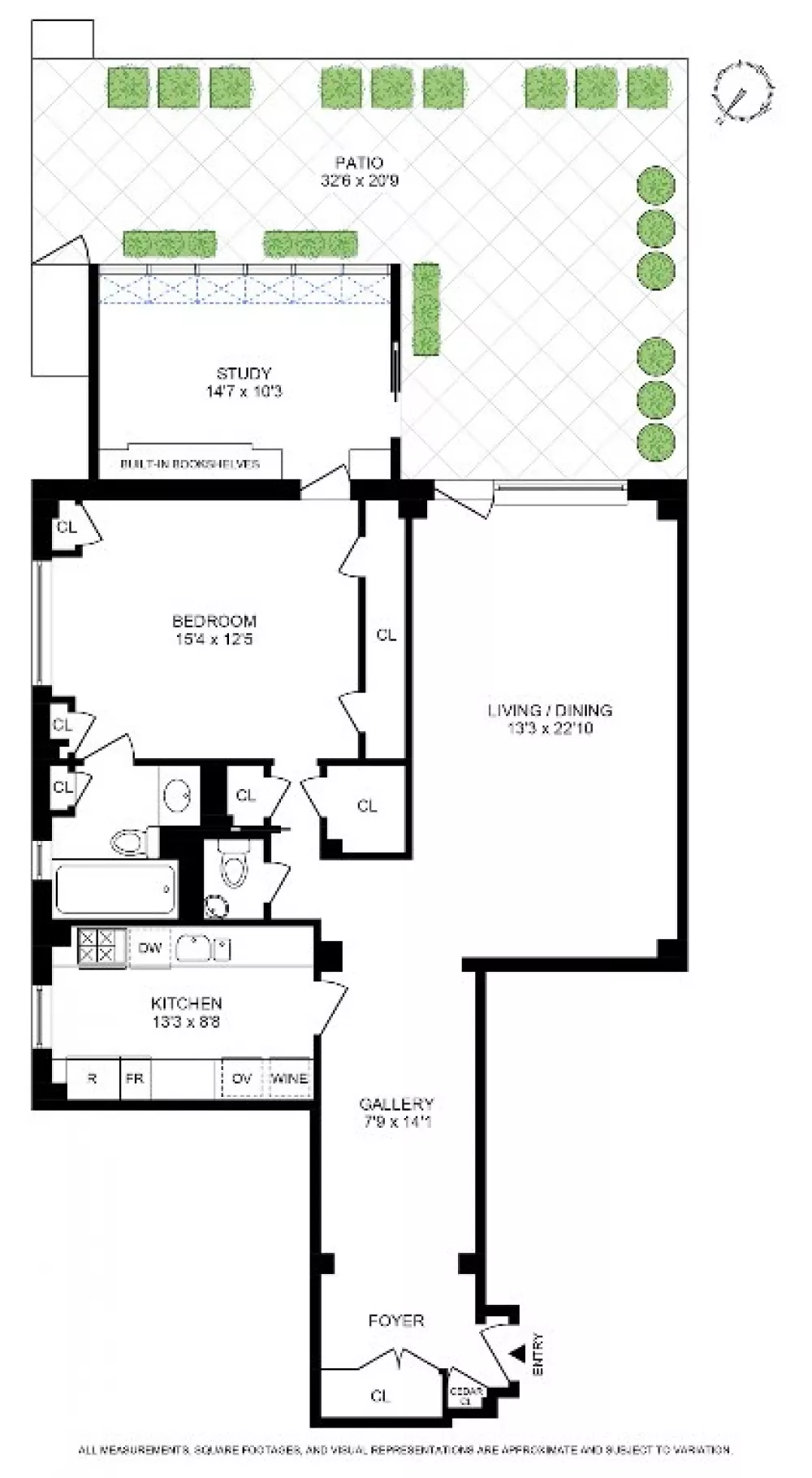 There is abundant storage throughout with eight closets. The terrace, accessible both through doors in the living room and the study, receives southern and eastern light throughout the day and is ideal for seasonal entertaining or quiet solitude.