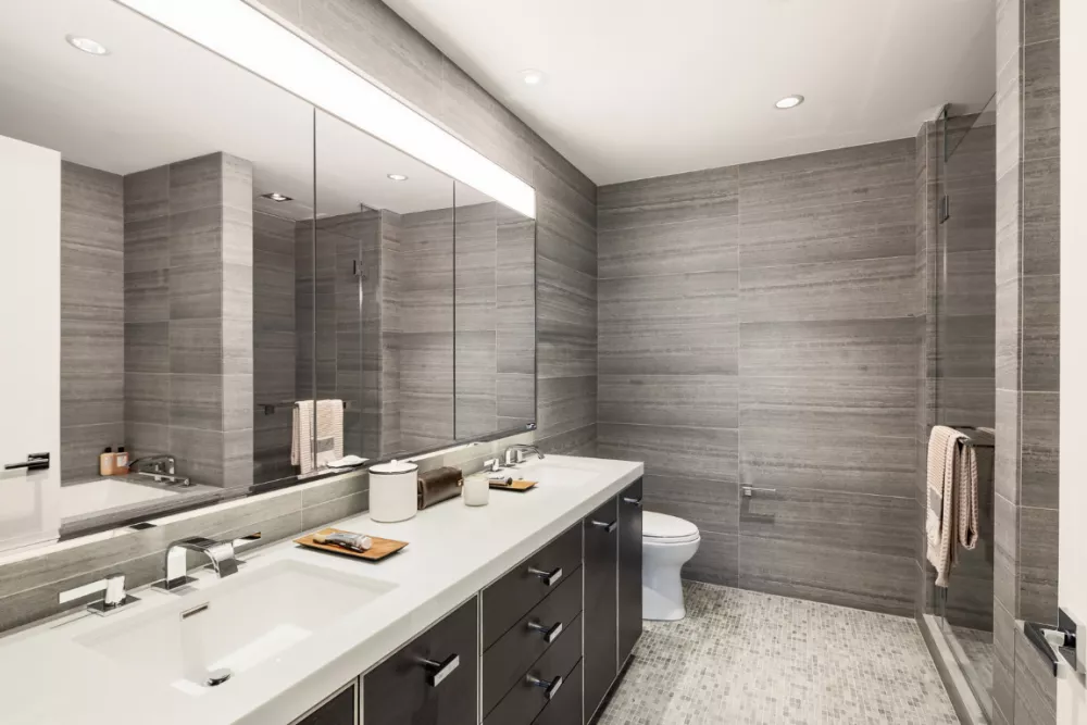 Residence 76E is a 1,400 square foot three-bedroom, two bathroom with an open gourmet kitchen and breakfast bar. This spacious corner residence faces Northeast with expansive Midtown, East Rivers, and iconic Empire State views. Warm, modern interiors are brought to life by the renowned design team at Meyer Davis Studio. This residence features imported stone and custom finishes, premium Miele appliance package, 5” wide stained oak flooring, master bath with custom wood cabinetry, marble tile walls and mosaic floors with radiant heat, under-mount Wetstyle sink with glass vanity top and Dornbracht polished chrome faucets and a washer and dryer.