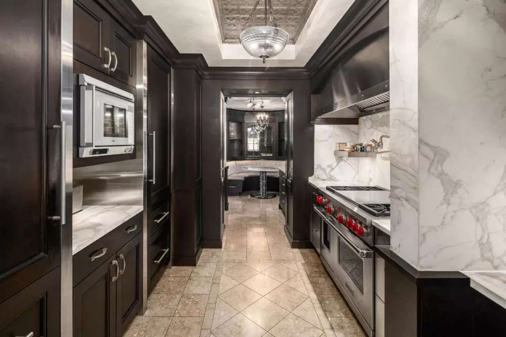 A museum-esque gallery hall leads into the sweeping Grand Salon and formal dining room-perfect for both intimate gatherings and large-scale entertaining. The St. Charles commercial-grade kitchen boasts custom cabinetry, marble countertops, and premium stainless-steel appliances, including a Wolf range with a griddle, two Sub-Zero refrigerators (each with a double freezer), a Miele dishwasher, a double sink with garbage disposal, a Gaggenau steam oven, a pot filler faucet, and a spacious pantry. A cozy breakfast room with a built-in banquette provides a charming space for casual meals. A home office (or additional bedroom), complete with a Murphy bed, powder room, and walk-in closet, adds functionality and flexibility.