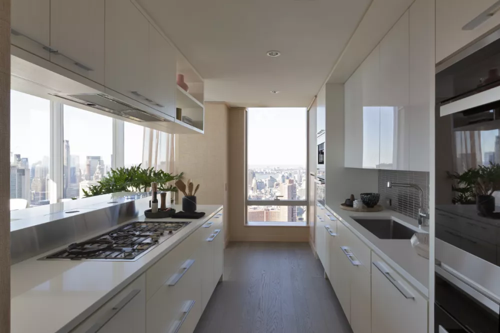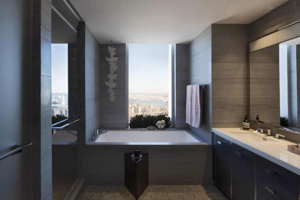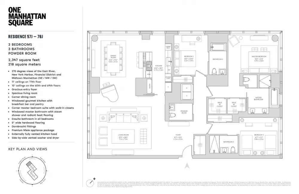 The Skyscape Collection, featuring Residence 63J, is a home in the sky. This generous 2,347 square foot triple exposure 3 bedroom, 3.5 bath residence is designed by Meyer Davis and features 270 degree views of the Lower East Waterfront, New York Harbor, Financial District and Midtown Manhattan. Astonishing panoramic views from South West and North West corner living room and dining room. Windowed gourmet kitchen with a breakfast bar, pantry closet, premium Miele and Subzero appliance package with a double oven plus speed oven, built-in whole-bean coffee system, wine fridge, dishwasher and externally fully vented kitchen hood. Corner Master Bedroom suite with side-by-side walk-in closets, luxuriously appointed windowed 5 fixture ensuite bath with a steam shower, Wetstyle soaking bathtub with custom stone surround, radiant floor heating and a separate water closet. The second and third bedrooms are thoughtfully appointed with en-suite baths with imported stone and custom finishes. This residence comes equipped with a side-by-side, fully vented washer and dryer. A gorgeous powder room with a Boffi pedestal sink and Covelano marble polished stone accent wall and floors completes this magnificent home.