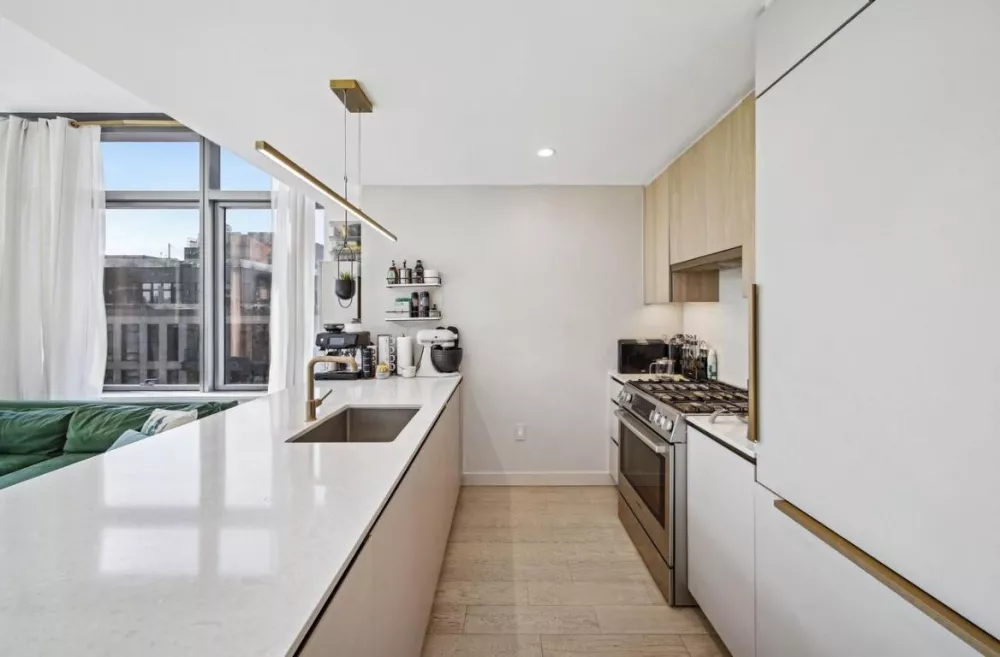 A welcoming foyer adorned with a large reach-in closet flows into an open-concept living room, dining room, and kitchen saturated with south west facing light. The kitchen is equipped with sleek quartz slab countertops, matching backsplashes, sand ash veneer and matte laminate cabinets, and a suite of fully-integrated Bosch appliances.