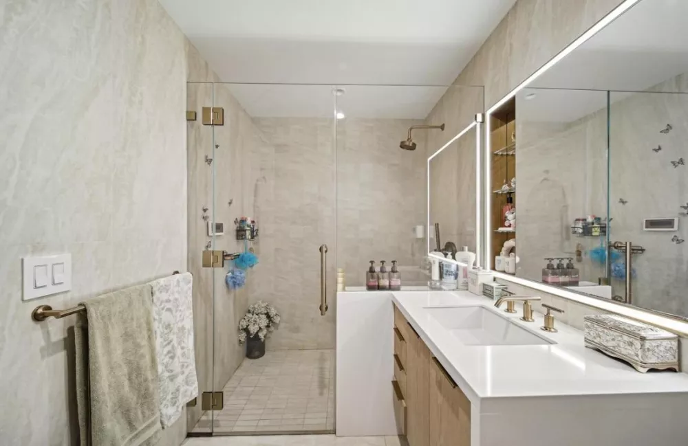 The primary bedroom has a walk-in closet and a sublime en-suite bathroom with porcelain walls and floors, a white quartz waterfall vanity, a custom built-in mirror vanity with integrated lighting, Toto toilet, and glass-enclosed walk-in shower with elegant Kohler Purist fixtures. The second bedroom has a private reach-in closet and easy access to a second full bathroom with a custom grey ash veneer vanity, a built-in mirror vanity, Toto toilet, and deep soaking tub.