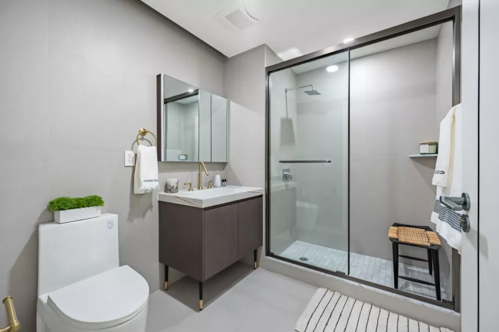 The bedroom has a deep reach-in closet, and the immaculate full bathroom has a custom vanity with storage and mirror, as well as an oversized glass-enclosed walk-in shower with oversized rainforest shower. Additional highlights include multi-zone heating and cooling, a Smart Lock keyless entry door, high ceilings with recessed lighting throughout, and an in-unit stacked Bosch washer/dryer.