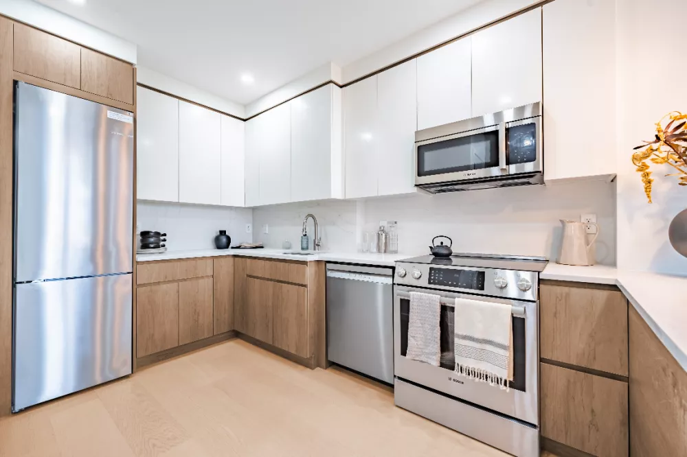 Residence 2B invitingly welcomes residents home with an open-concept living room, dining room, and kitchen. The living area leads directly out to the balcony, while the kitchen is expertly crafted with an eat-in waterfall peninsula with overhang for modern breakfast bar stool seating, custom two-tone oak cabinetry, gleaming quartz countertops and backsplash, and a full suite of high-end stainless steel Bosch appliances, including a refrigerator with a filtered water dispenser.