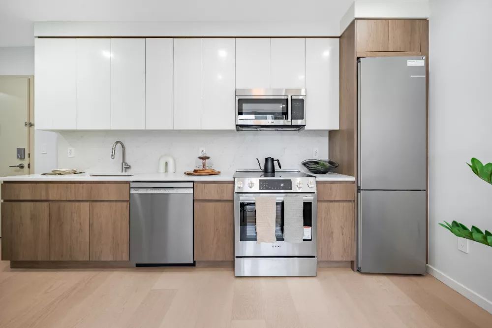 Residence 6A invitingly welcomes residents home with an open-concept living room, dining room, and kitchen. The living area leads directly out to the balcony, while the kitchen is expertly crafted with an eat-in waterfall peninsula with overhang for modern breakfast bar stool seating, custom two-tone oak cabinetry, gleaming quartz countertops and backsplash, and a full suite of high-end stainless steel Bosch appliances, including a refrigerator with a filtered water dispenser.