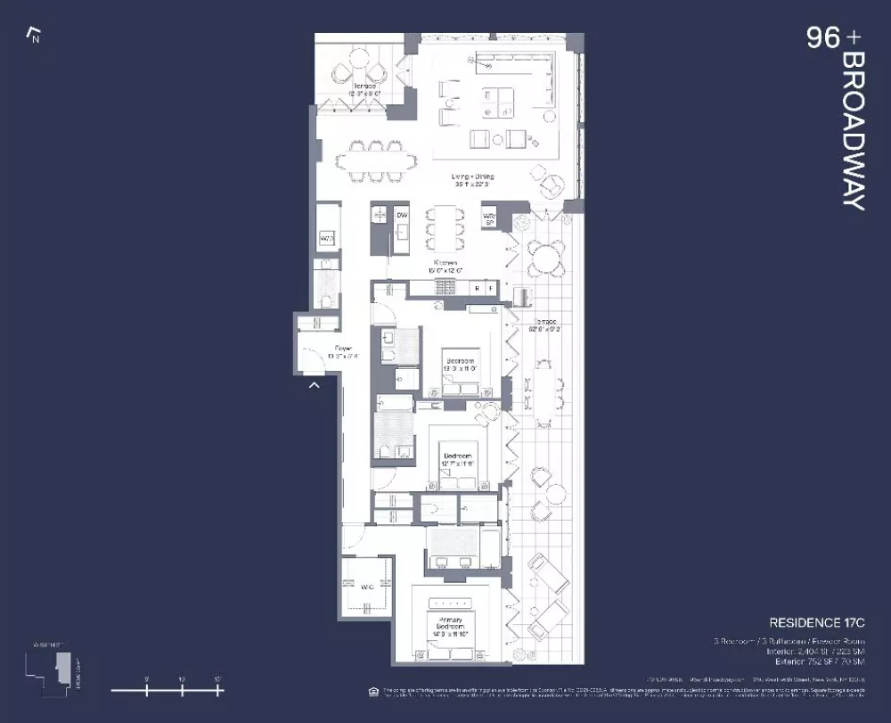 Introducing Residence 17C, a gracious corner 2,404 square foot 3 bedroom, 3.5 bath home with 2 private terraces and 10'8" ceilings. This beautifully appointed apartment has floor-to-ceiling casement windows showcasing open views in every direction. French doors in every room lead to a 627 sq ft terrace, the perfect spot to dine or entertain al fresco, or simply enjoy the sweeping city views. An additional west-facing 125 sq ft terrace off the dining area provides beautiful Hudson River views.