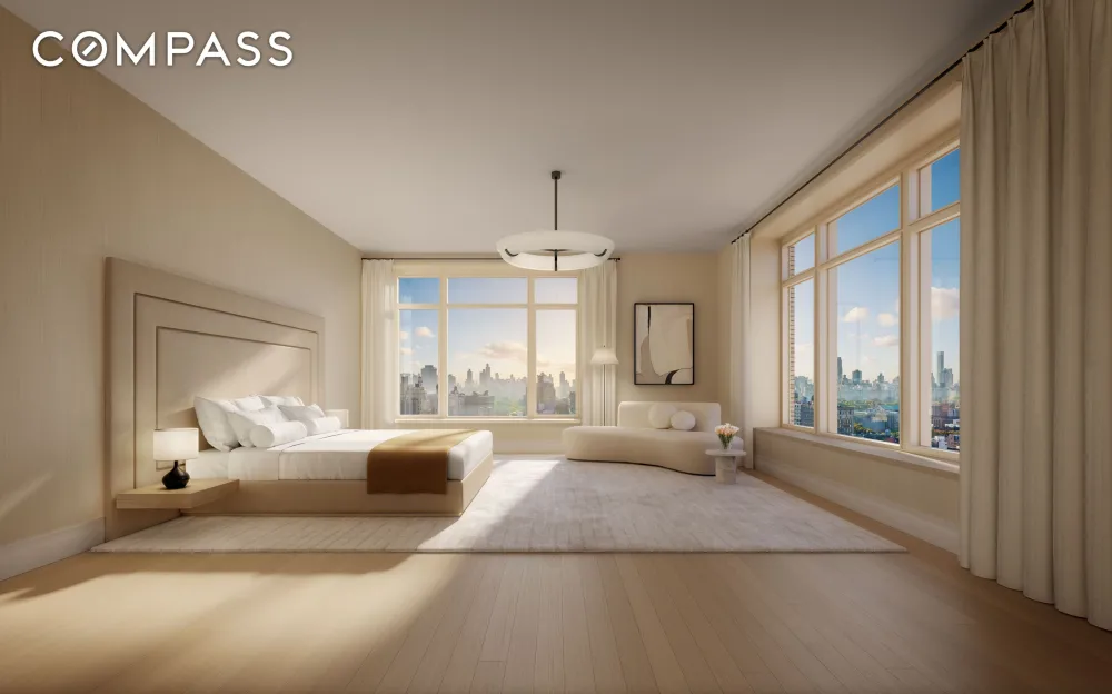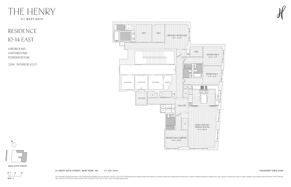 Residence 12E at The Henry is a graciously proportioned 4-bedroom apartment with wonderful Park and open city views east and south from every room. Direct elevator access into a private foyer opens to a square gallery and a corner loft-like living room with breathtaking views of Central Park and the southern skyline. A large eat-in kitchen, with a picture window facing east to the Park, has pocket doors, allowing it to be an open kitchen or closed for more formal moments. All four bedrooms have ensuite baths and generous closet space. One secondary bedroom could easily be a library, and another could be incorporated to create a primary suite. The primary bedroom is ideally located for privacy and has a stunning five fixture bath and two very large walk-in closets. 12E has a full-sized laundry room with a sink, a second apartment entrance and a lovely powder room.