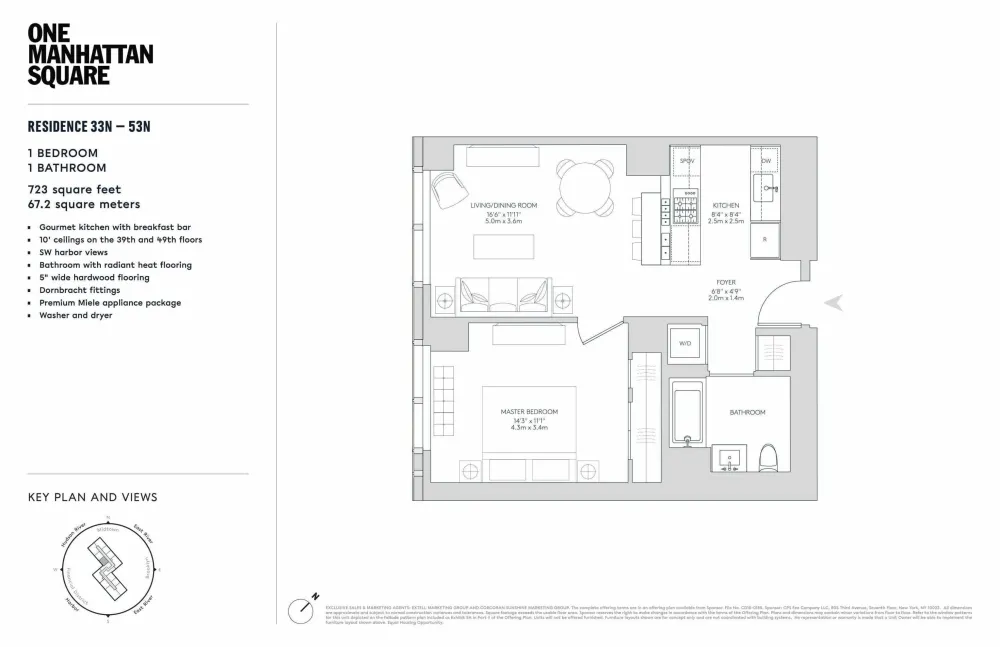 ONE MANHATTAN SQUARE OFFERS ONE OF THE LAST 20-YEAR TAX ABATEMENTS AVAILABLE IN NEW YORK CITY 10 ft Ceiling Height Premium Residence 49N is a 723 square foot one bedroom, one bathroom with an open gourmet kitchen and breakfast bar. This spacious residence faces South West, with spectacular sunset views... See more