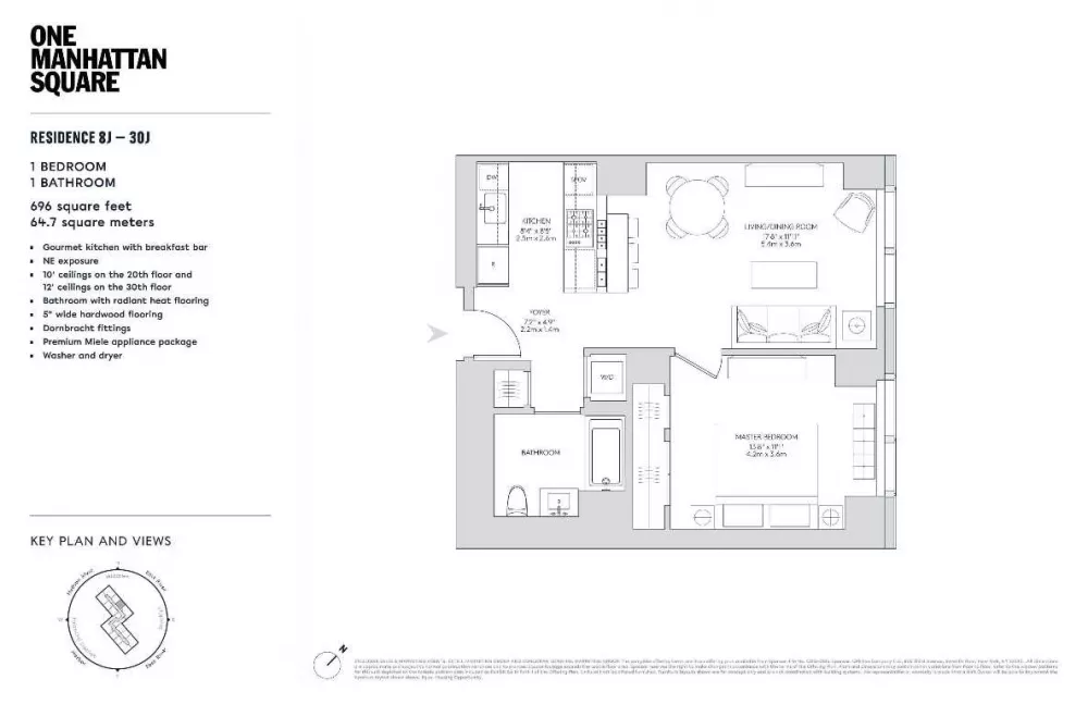 Residence 20J is a 696 square foot one bedroom, one bathroom with an open gourmet kitchen and breakfast bar. This spacious residence faces North East with East River and Williamsburg Bridge views. Warm, modern interiors are brought to life by the renowned design team at Meyer Davis Studio. This residence features imported stone and custom finishes, premium Miele appliance package, 5" wide stained oak flooring, master bath with custom wood cabinetry, marble tile walls and mosaic floors with radiant heat, under-mount Wetstyle sink with glass vanity top and Dornbracht polished chrome faucets and a washer and dryer.