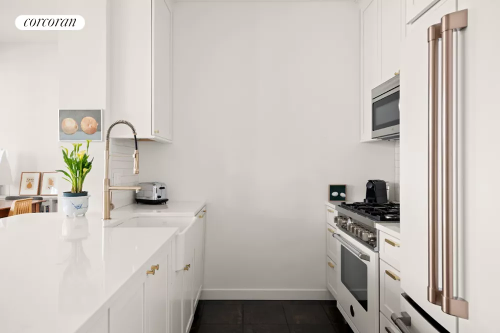 The chef's kitchen is beautifully detailed in both form and function, featuring custom cabinetry, quartz countertops, and a suite of premium appliances, including a Café counter-depth French-door refrigerator, Bertazzoni five-burner stove and microwave, Asko dishwasher, and an in-unit LG washer/dryer combo. The peninsula island allows for counter seating and effortless flow into the living and dining areas, making the space equally suited to entertaining and everyday ritual.