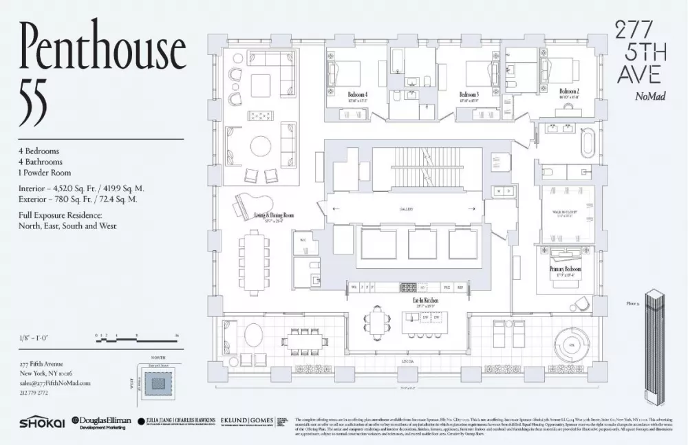 Penthouse 55 at 277 Fifth Avenue is a spectacular full-floor, four-bedroom residence spanning 4,520 interior SF and 780 exterior SF with unparalleled views across the city and beyond. Accessed by a keyed elevator, Penthouse 55 opens up into an expansive, 53" x 21" Great Room with sweeping views of the Hudson River, framed by floor-to-ceiling windows. Take in dazzling sunsets from the adjacent 75-foot-long private loggia.