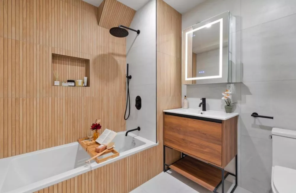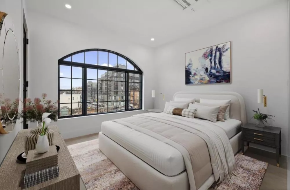 The bedroom can accommodate a king-size bed and has a large reach-in closet, an oversized arched window, and direct access to the terrace. The pristine spa bathroom boasts gray porcelain tile floors, ribbon maple tile walls, a custom Fine Fixture vanity, an LED-lit vanity mirror, matte black Artos fixtures, an Icera toilet, and a deep soaking tub. The home also has a washer/dryer hookup and Mitsubishi multi-zone split units for heating and cooling.