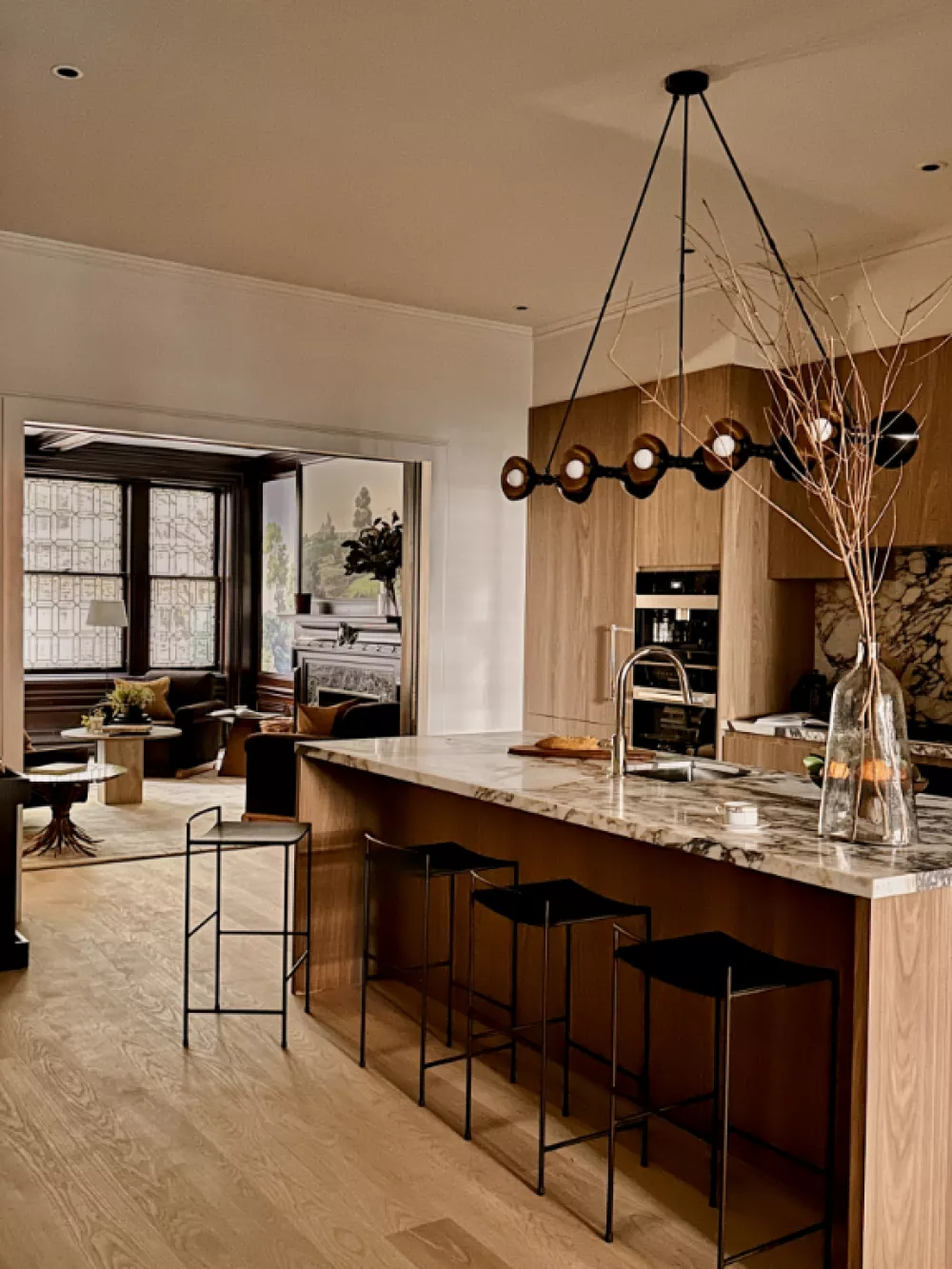 Set in a spacious, 25.5 feet wide turn-of-the-century, 9,000sf Colonial Revival mansion, the three distinctly unique homes, feature many of the home's original details and offer comfortable multi level layouts with king sized bedrooms, large bathrooms, generous closet and storage space and beautiful private outdoor spaces. The carefully selected finishes include Ash wood floor planks by Dinesen imported from Denmark, Calacatta Viola marble countertops imported from Italy, custom Shinnoki wood cabinets made in Belgium, and a full Miele appliance package. Bathrooms and kitchens feature fixtures by Waterworks, Grohe, and Porcelanosa with natural stone countertops in Ocean Blue Travertine and Belvedere Leather natural stones.